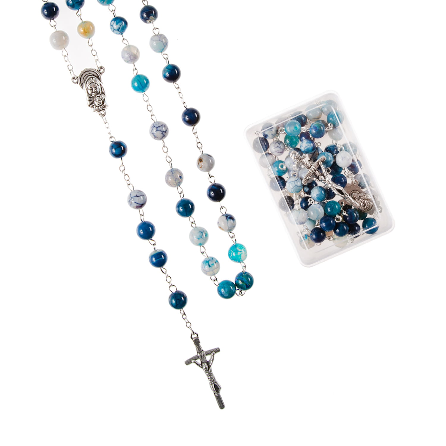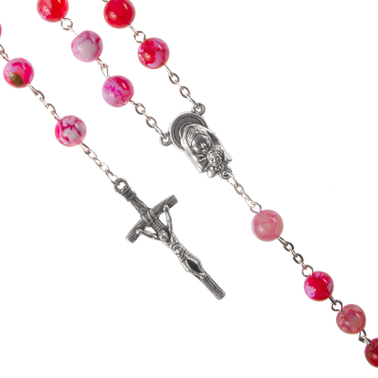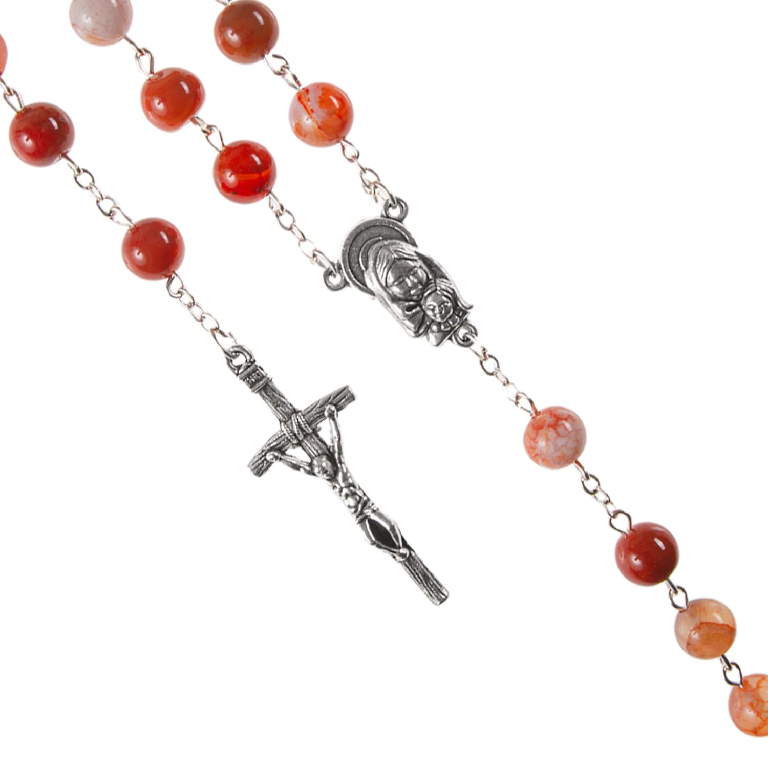 Różaniec wykonany z kamienia naturalnego - agat. Koraliki różańca w stylu - marmurek. Łącznik różańca z wizerunkiem Matki Boskiej oraz krzyżyk papieski w tonacji starego srebra. Elementy metalowe wykonane ze stali nierdzewnej. Różaniec w plastikowym pudełeczku.