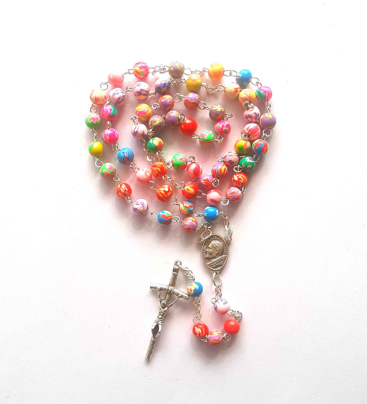 Różaniec z tworzywa (kauczuk) dla dzieci i nastolatków. Koraliki o kształcie kuleczek o różnych kolorach. Kolory są soczyste i głębokie. Elementy metalowe różańca wykonane są ze stali nierdzewnej. Medalik z Janem Pawłem II, a na rewersie wizerunek Matki Boskiej Częstochowskiej z Dzieciątkiem. Medalik i krzyżyk papieski w kolorze srebrnym.