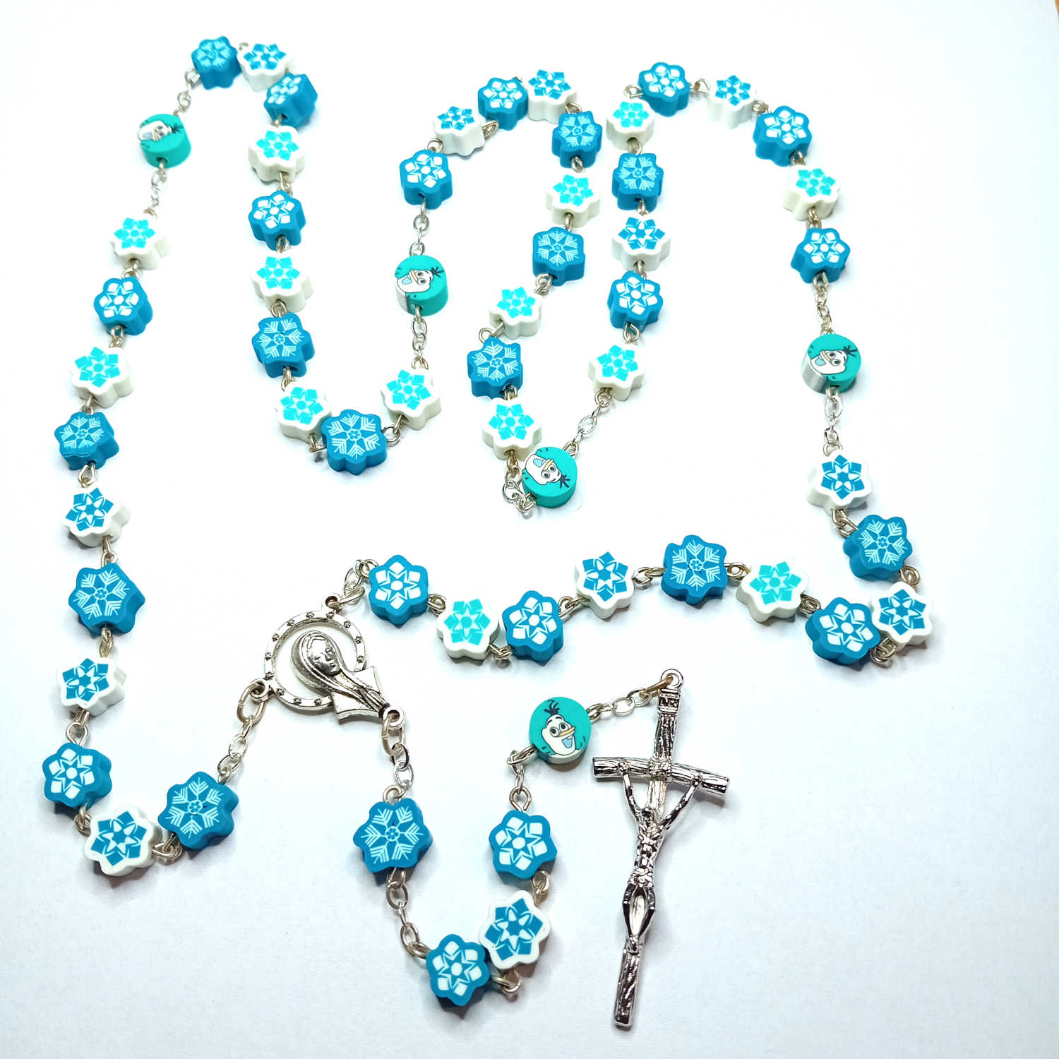 Koronka różańca składa się z miękkich, elastycznych kwiatuszków kauczukowych w odcieniach bieli i niebieskiego. Białe kulki symbolizują czystość, a niebieskie nawiązują do zimowego nieba i lodowej scenerii. Wśród koralików znajdują się drobne ozdobniki w kształcie gwiazdek śnieżnych, które przywodzą na myśl zimowe wieczory pełne magii oraz bałwanki – przyjazne postacie, które nadają całości świątecznego charakteru.