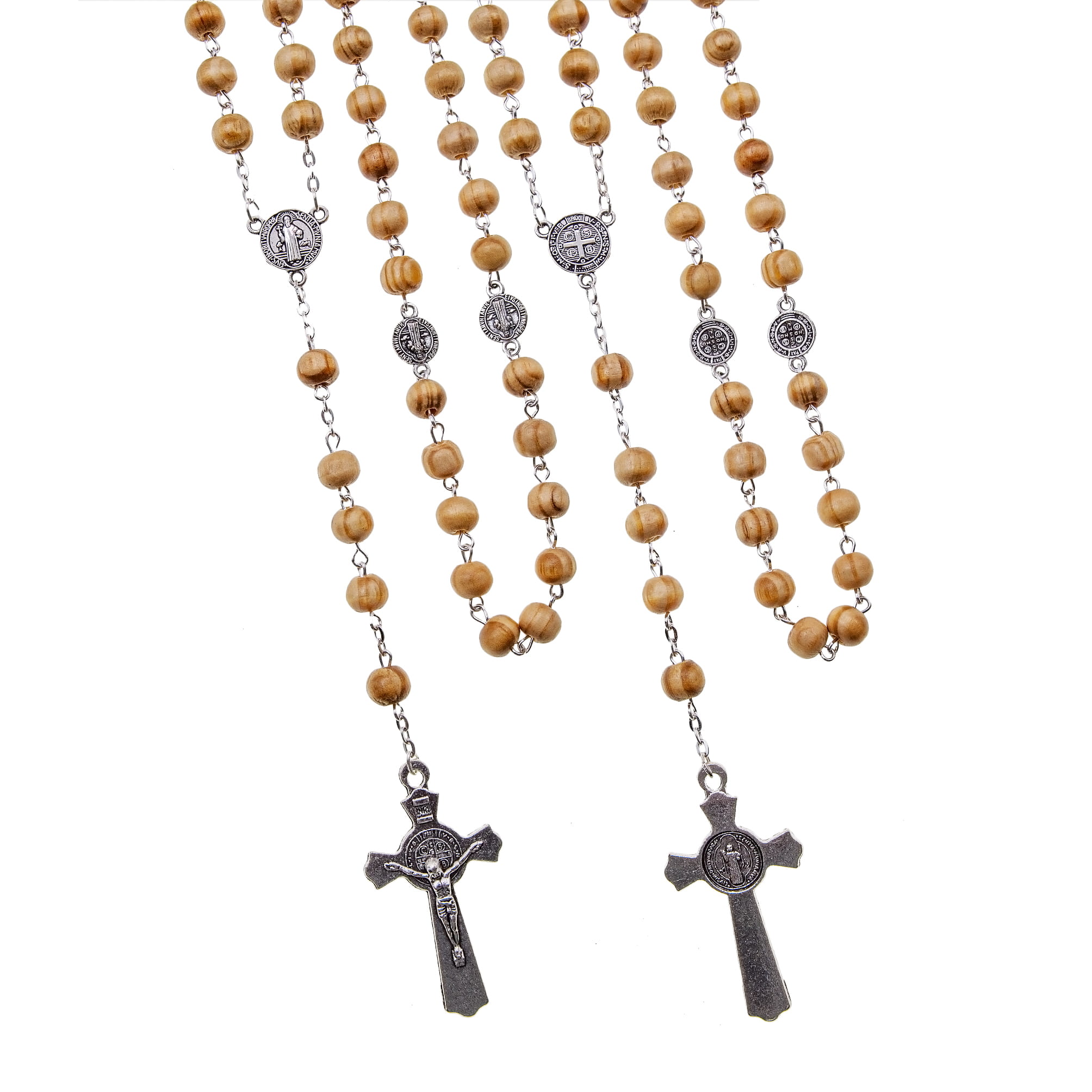 Różaniec św. Benedykta, drewniany. Łącznik różańca to medalion św. Benedykta. Krzyżyk również z medalionem Benedykta. Elementy metalowe wykonane ze stali nierdzewnej. Koraliki w odcieniu naturalnego drewna zabezpieczone lakierem.
