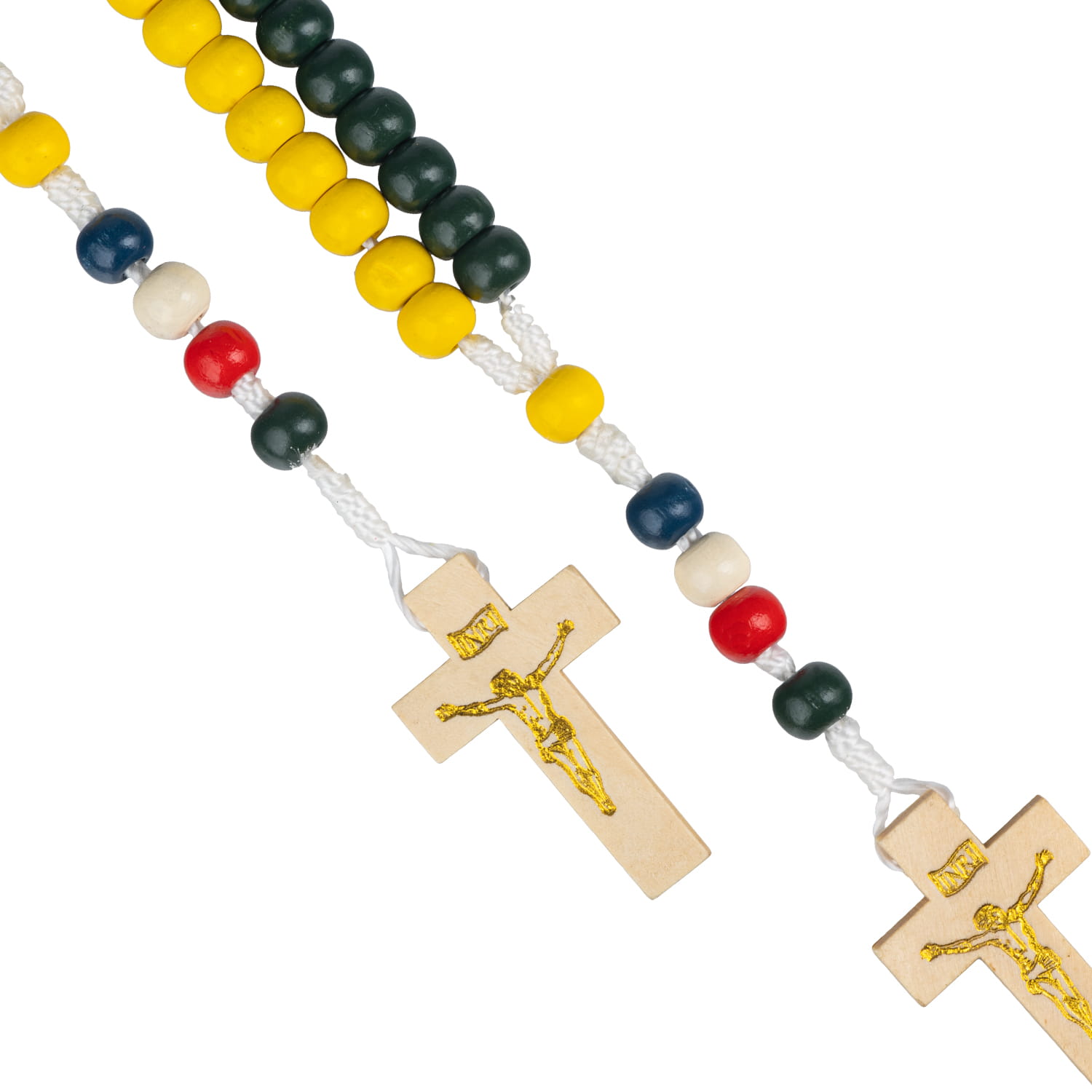 Różaniec drewniany kolorowy misyjny. Paciorki lakierowane. Krzyżyk w kolorze naturalnego drewna z pasyjką. Koraliki na sznurku.