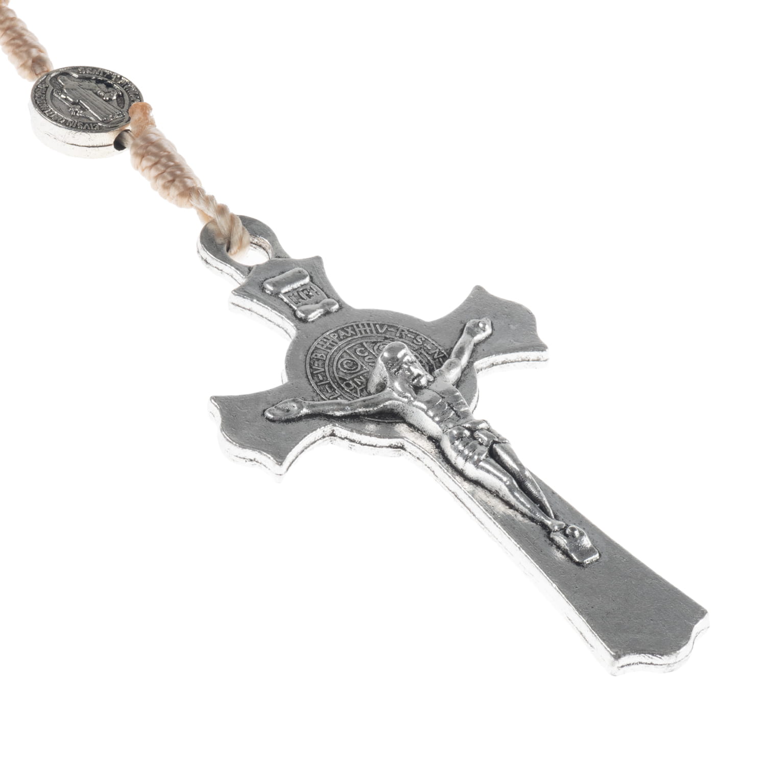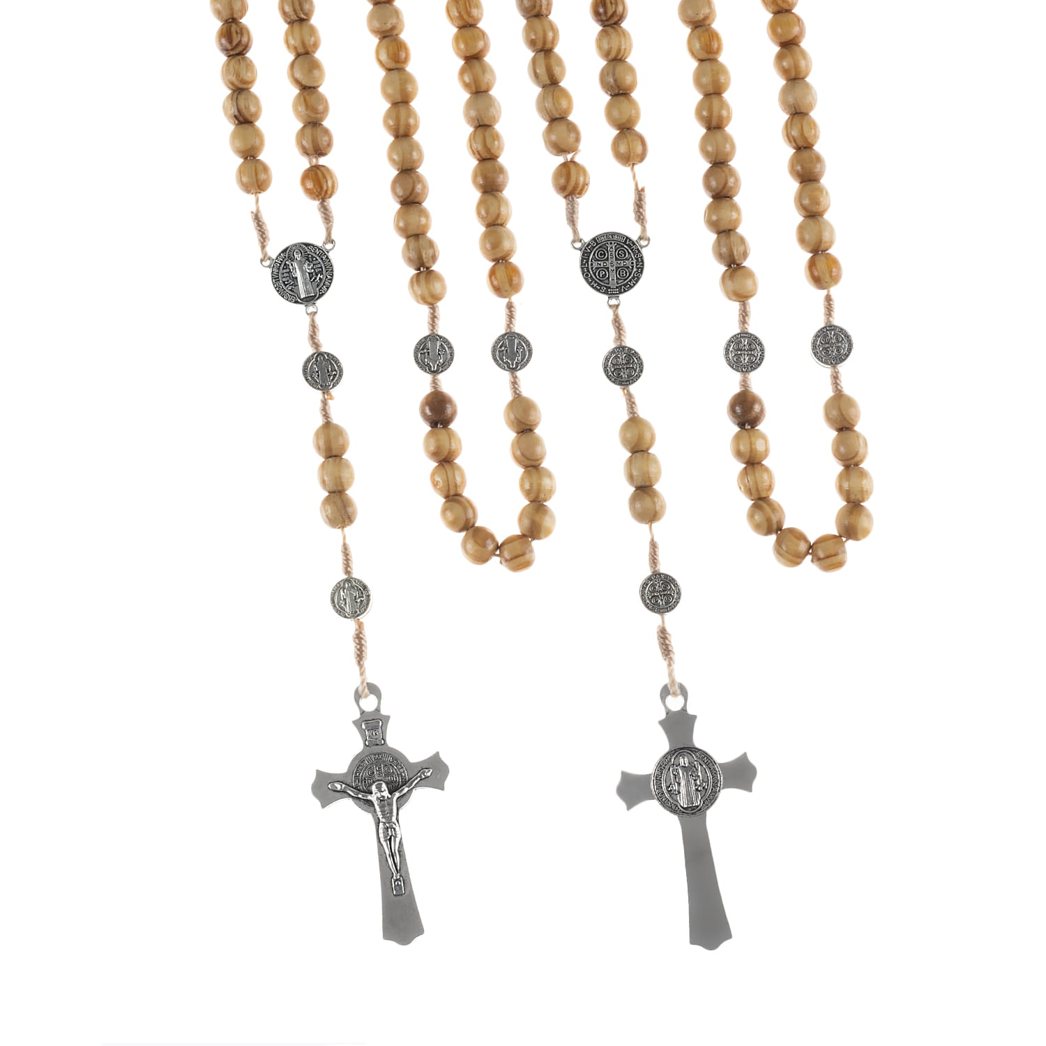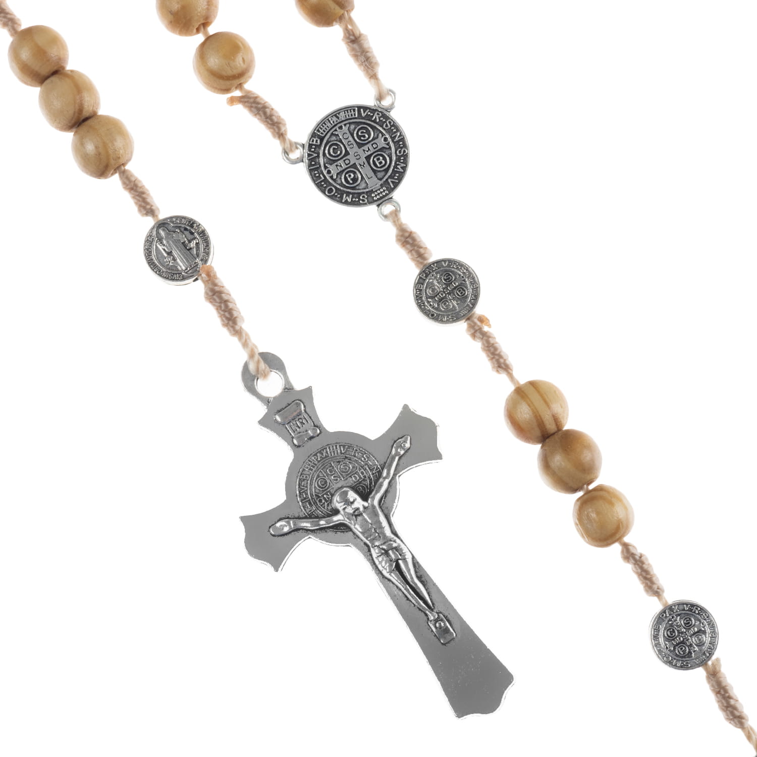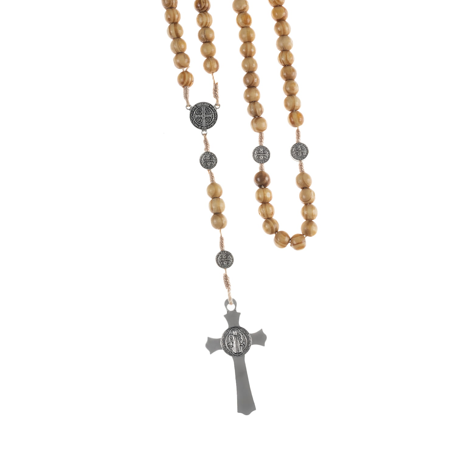 Różaniec św. Benedykta, drewniany. Łącznik różańca to medalion św. Benedykta. Krzyżyk również z medalionem Benedykta. Elementy metalowe wykonane ze stali nierdzewnej. Koraliki w odcieniu naturalnego drewna zabezpieczone lakierem.