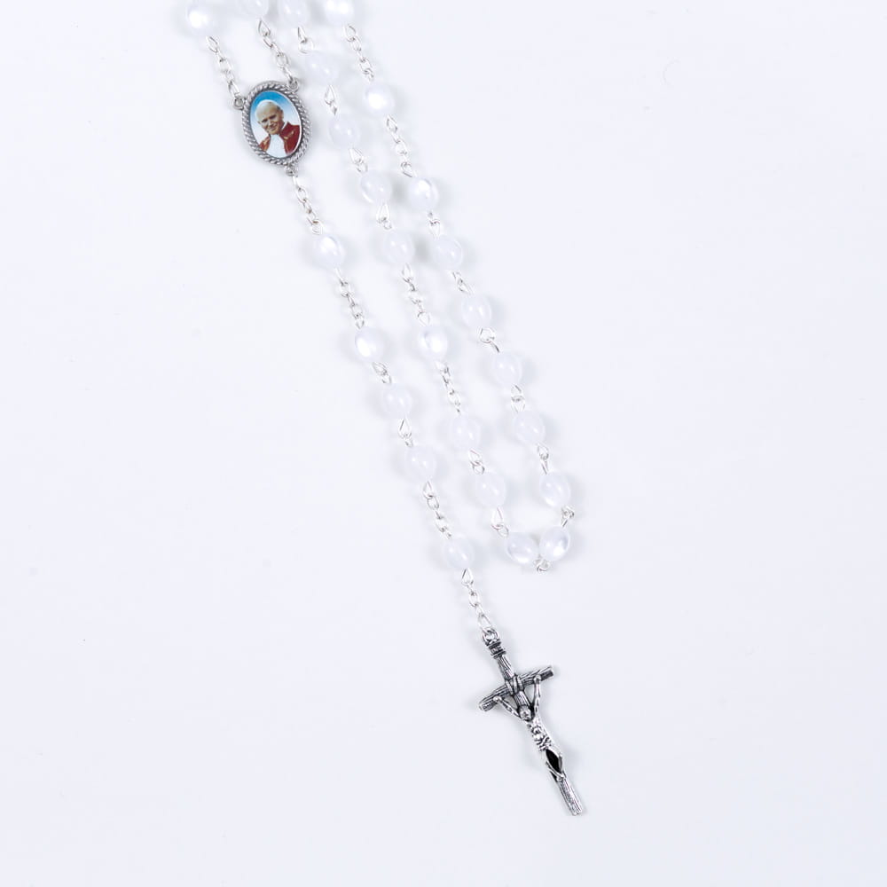 Różaniec wykonany z lekkich, plastikowych paciorków nawleczonych na trwały sznurek. Prosta i praktyczna forma sprawia, że jest idealny do codziennego użytku.