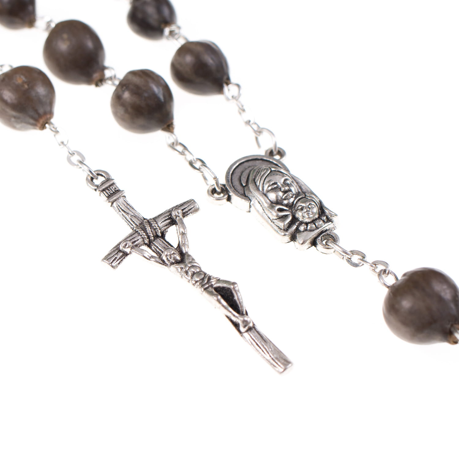 Różaniec z nasion naturalnych Łzy Hioba - łzawica ogrodowa. Łącznik różańca z Matką Bożą. Elementy metalowe wykonane ze stali nierdzewnej. Krzyżyk w tonacji starego srebra.