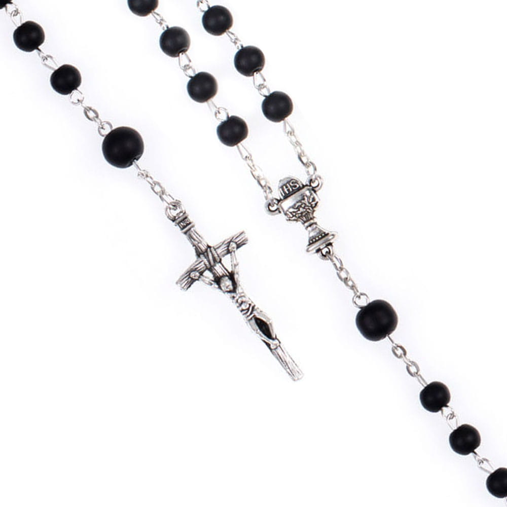 Różaniec do Pierwszej Komunii dla chłopca lub dziewczynki w czterech kolorach. Czarny, niebieski, bezbarwny oraz różowy. Koralik z efektem mrożonego szkła. Sztyft ze stali nierdzewnej.