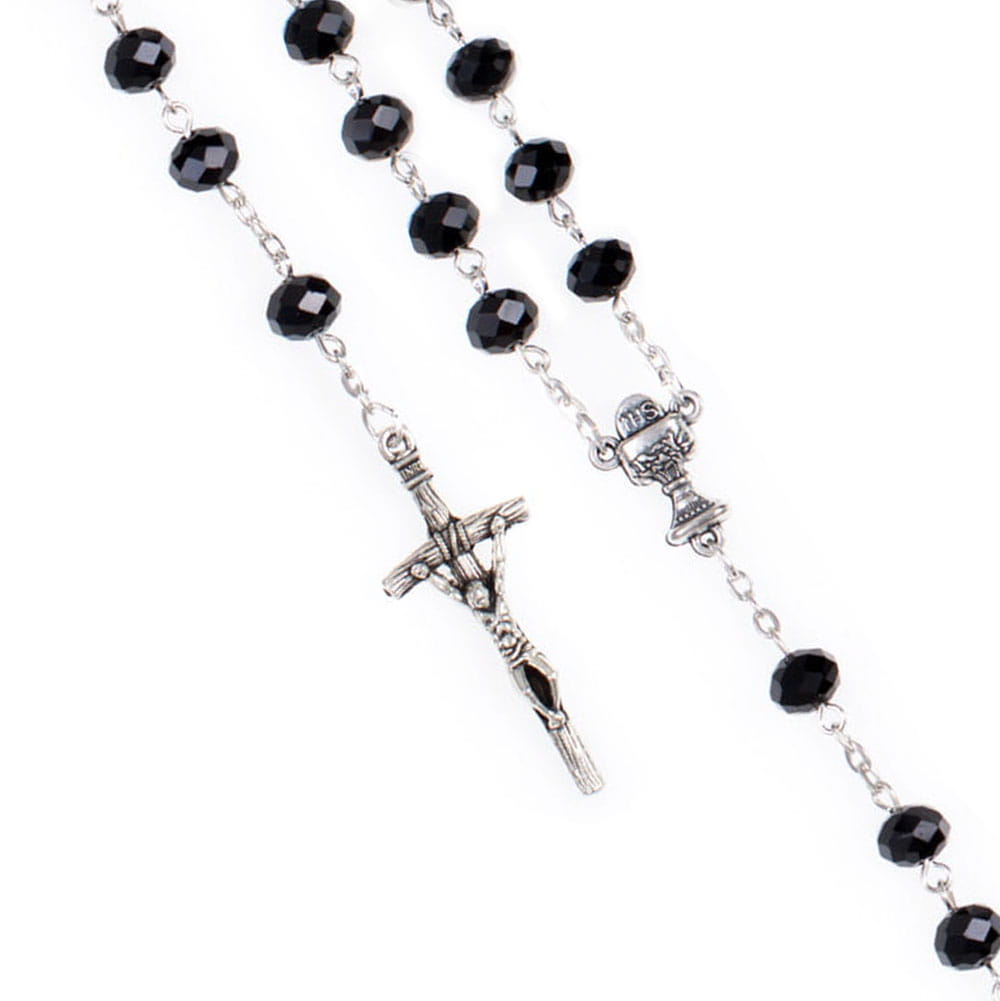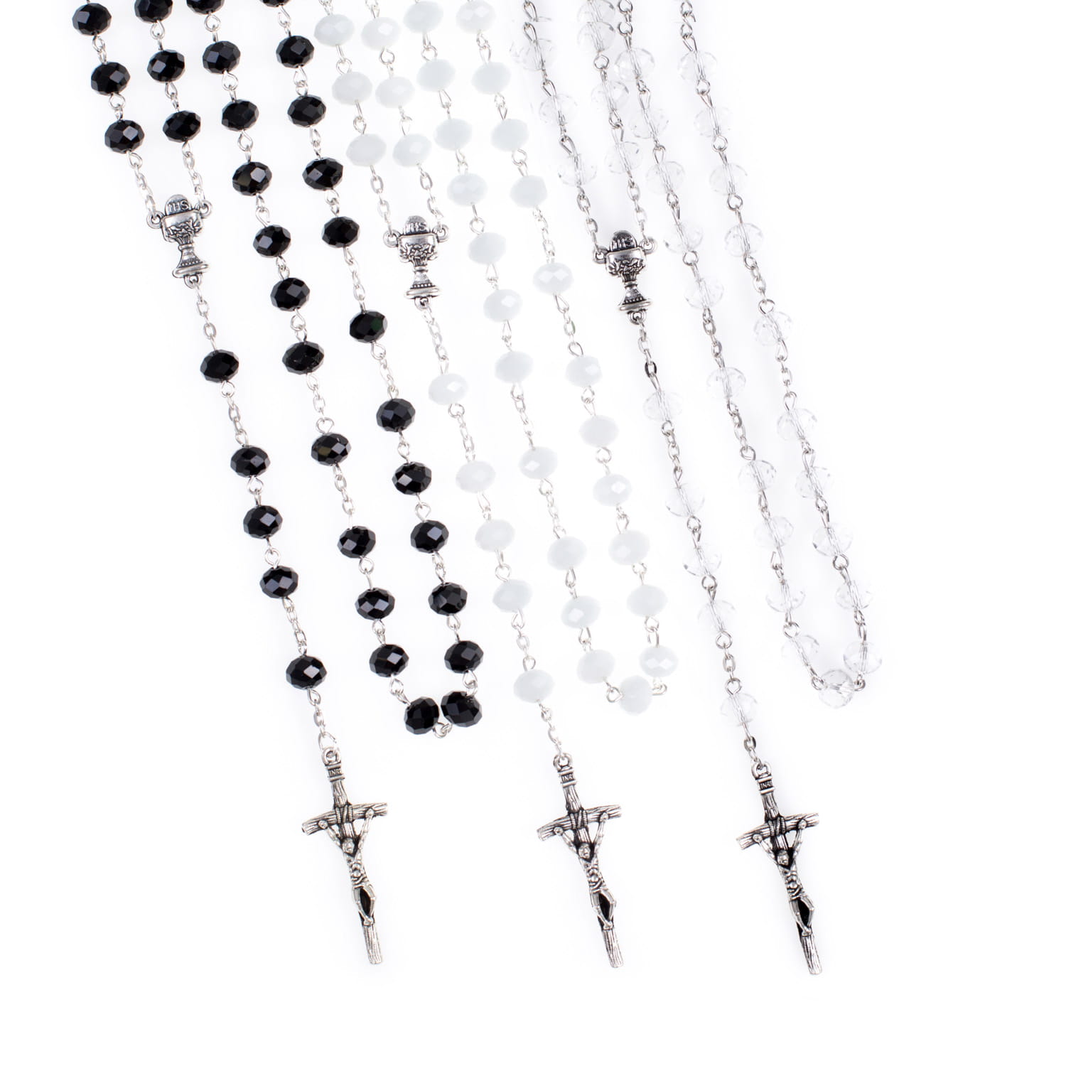 Różaniec komunijny dla chłopców i dziewczynek. Różaniec ze szkła szlifowanego, kryształ w trzech wariantach kolorystycznych, biały , czarny, transparentny. Paciorki nieco spłaszczone. Sztyft ze stali nierdzewnej.