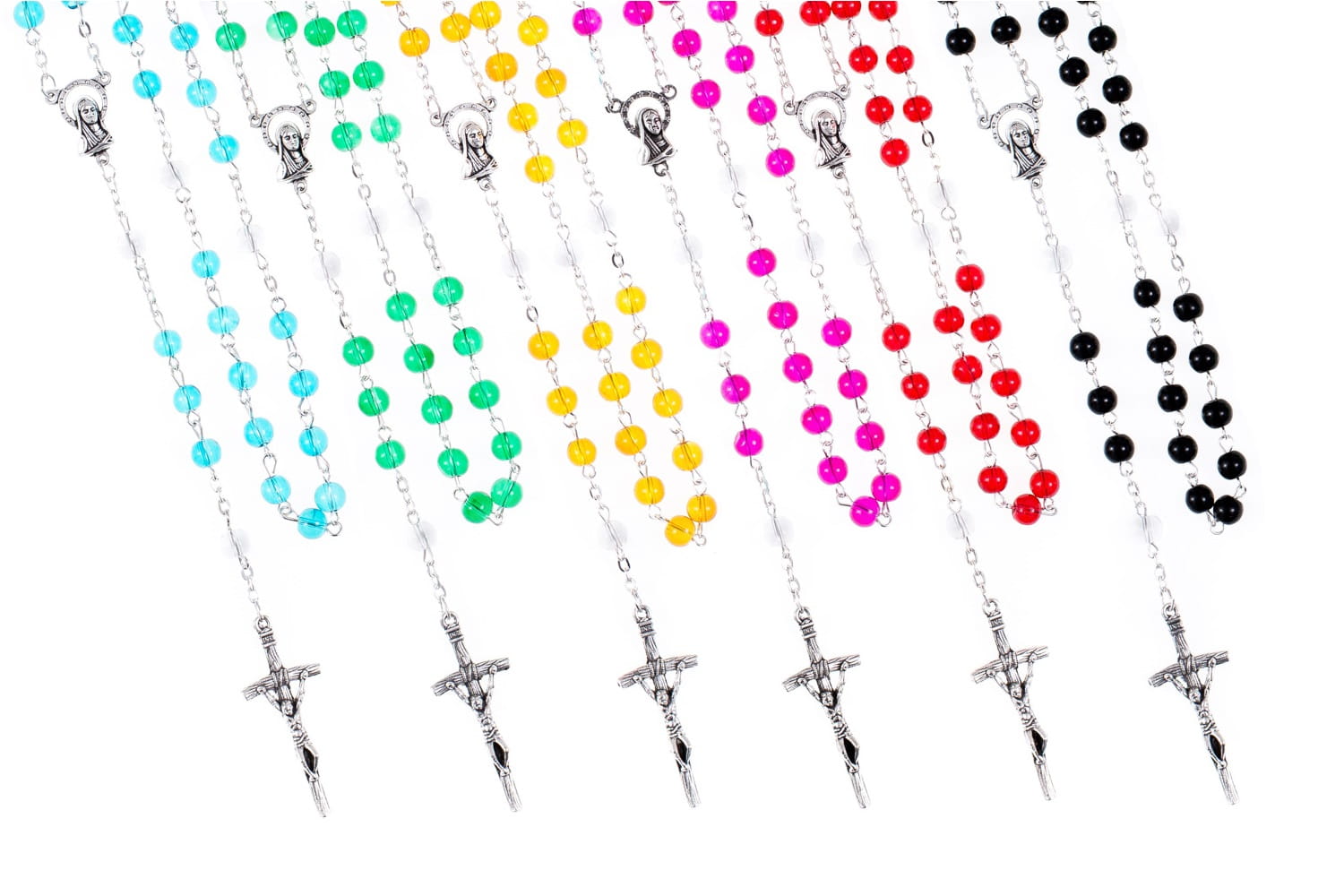Różaniec Święty szklany. Kilka wariantów kolorystycznych. Modlitwa Do różańca w czterech językach, polskim,angielskim, włoskim i hiszpańskim. Elementy metalowe wykonane ze stali nierdzewnej. Medalik-łącznik z Matką Boską. Krzyżyk w tonacji starego srebra.