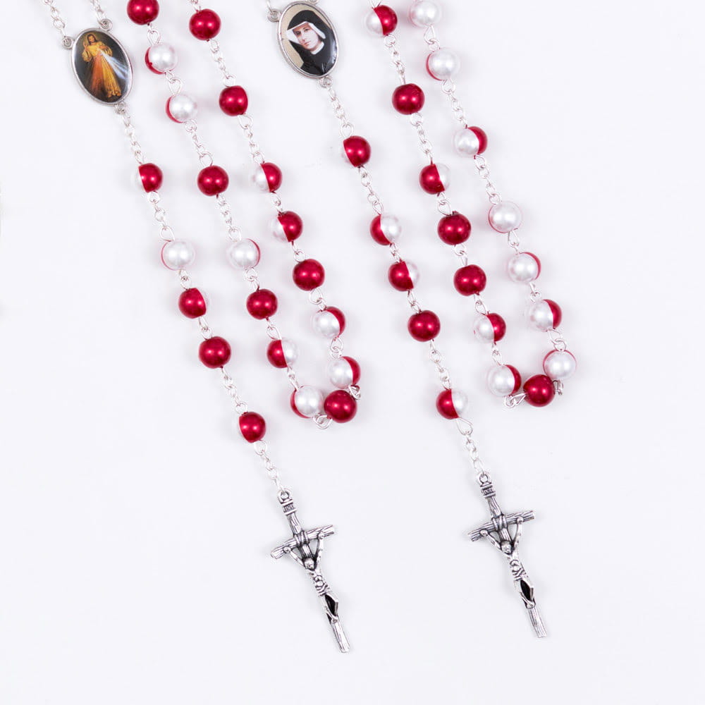 Różaniec szklany z powłoką perłową. Łącznik różańca z Jezusem Miłosiernym i Siostrą Faustyną. Koraliki czerwone i białe. Elementy metalowe wykonane ze stali nierdzewnej. Krzyżyk w tonacji starego srebra.