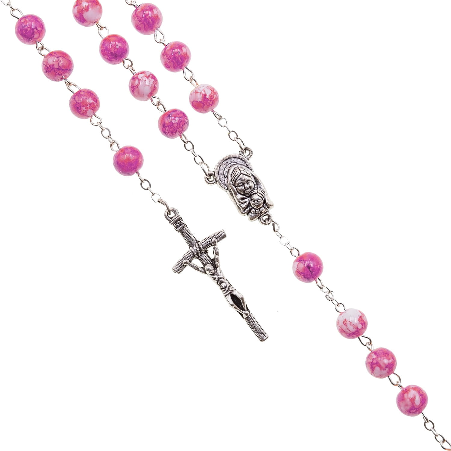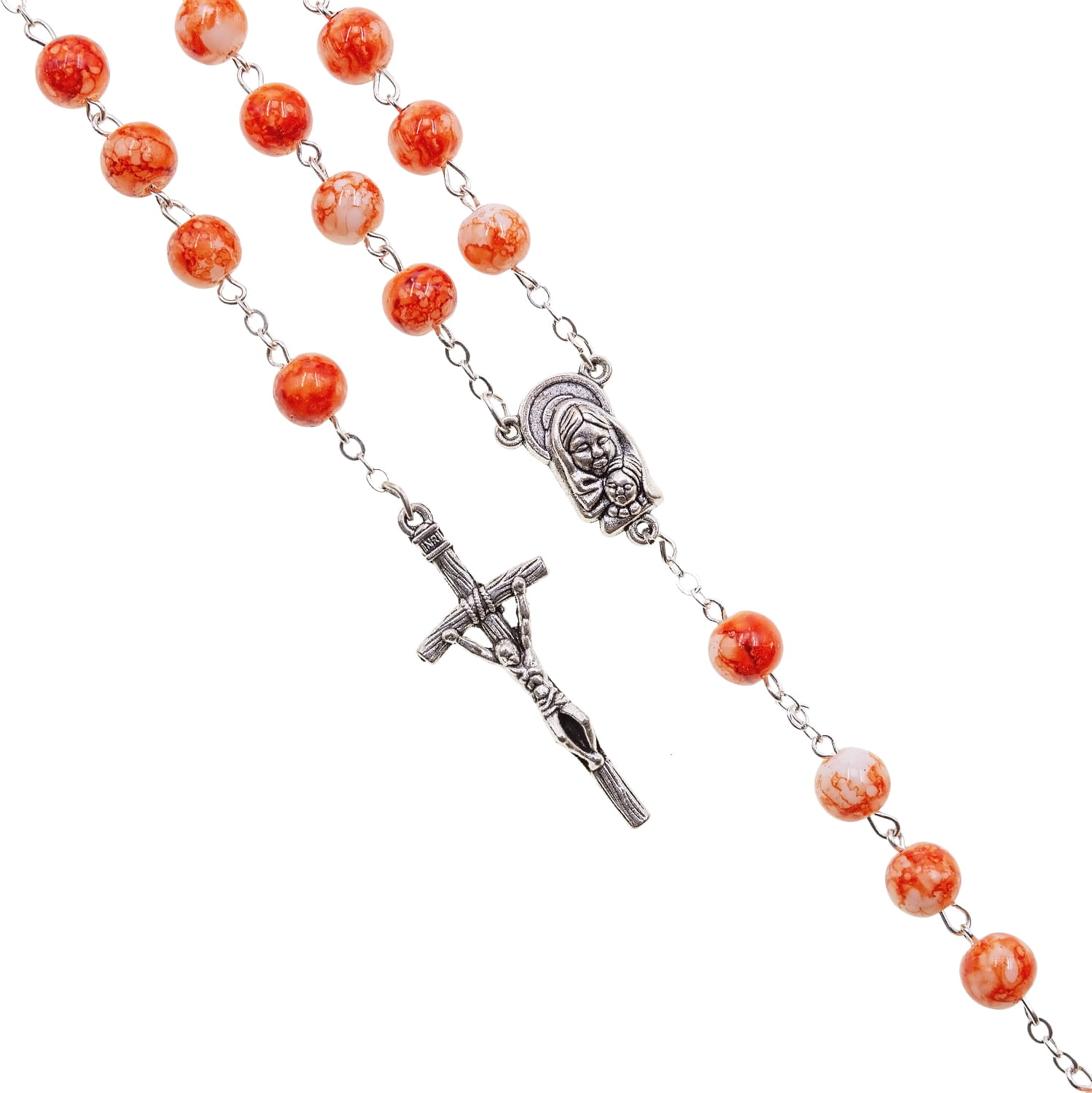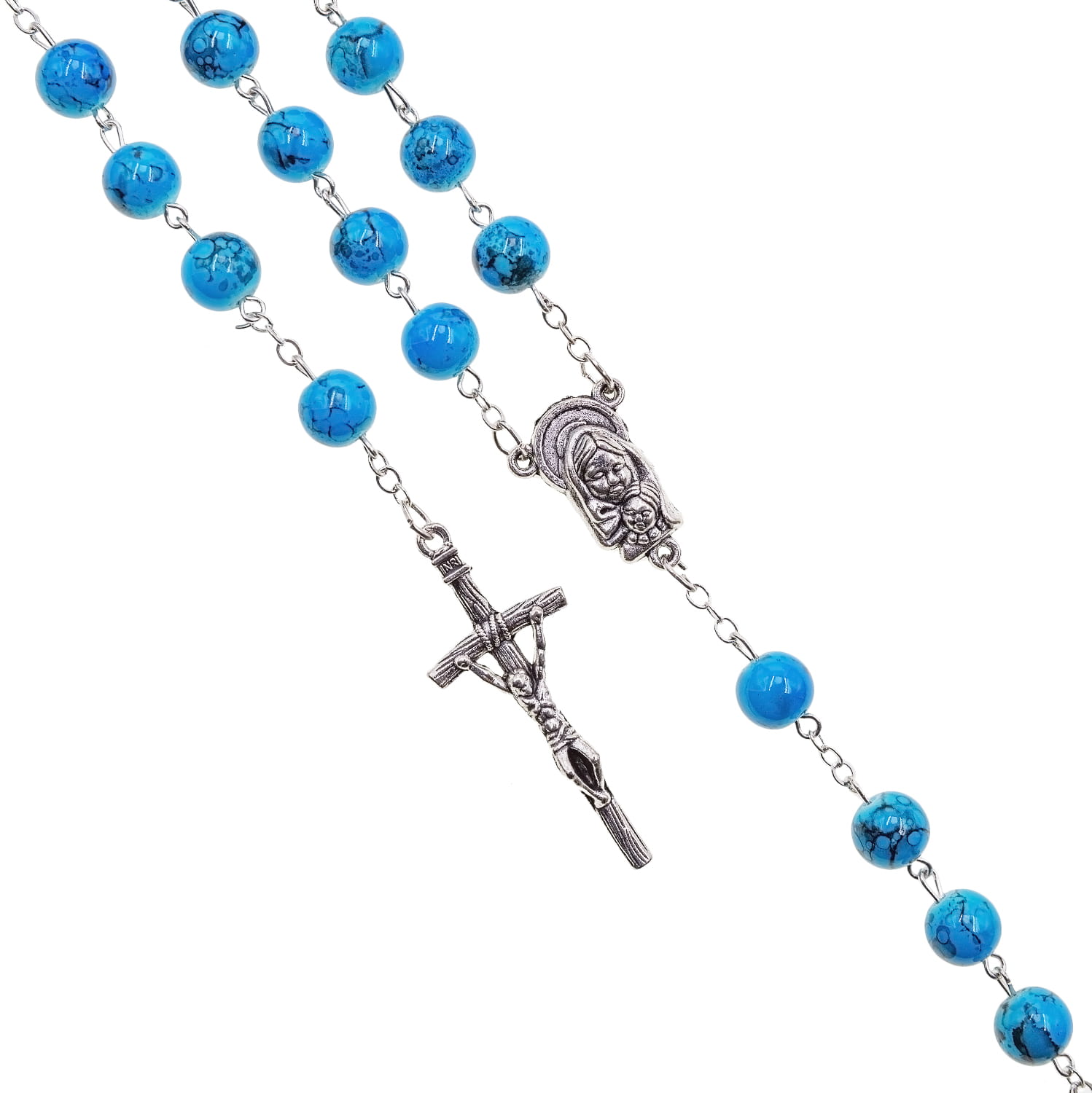 Różaniec szklany marmurkowy. Łącznik różańca z Matką Bożą z dzieciątkiem. Elementy metalowe wykonane ze stali nierdzewnej. Krzyżyk w tonacji starego srebra.