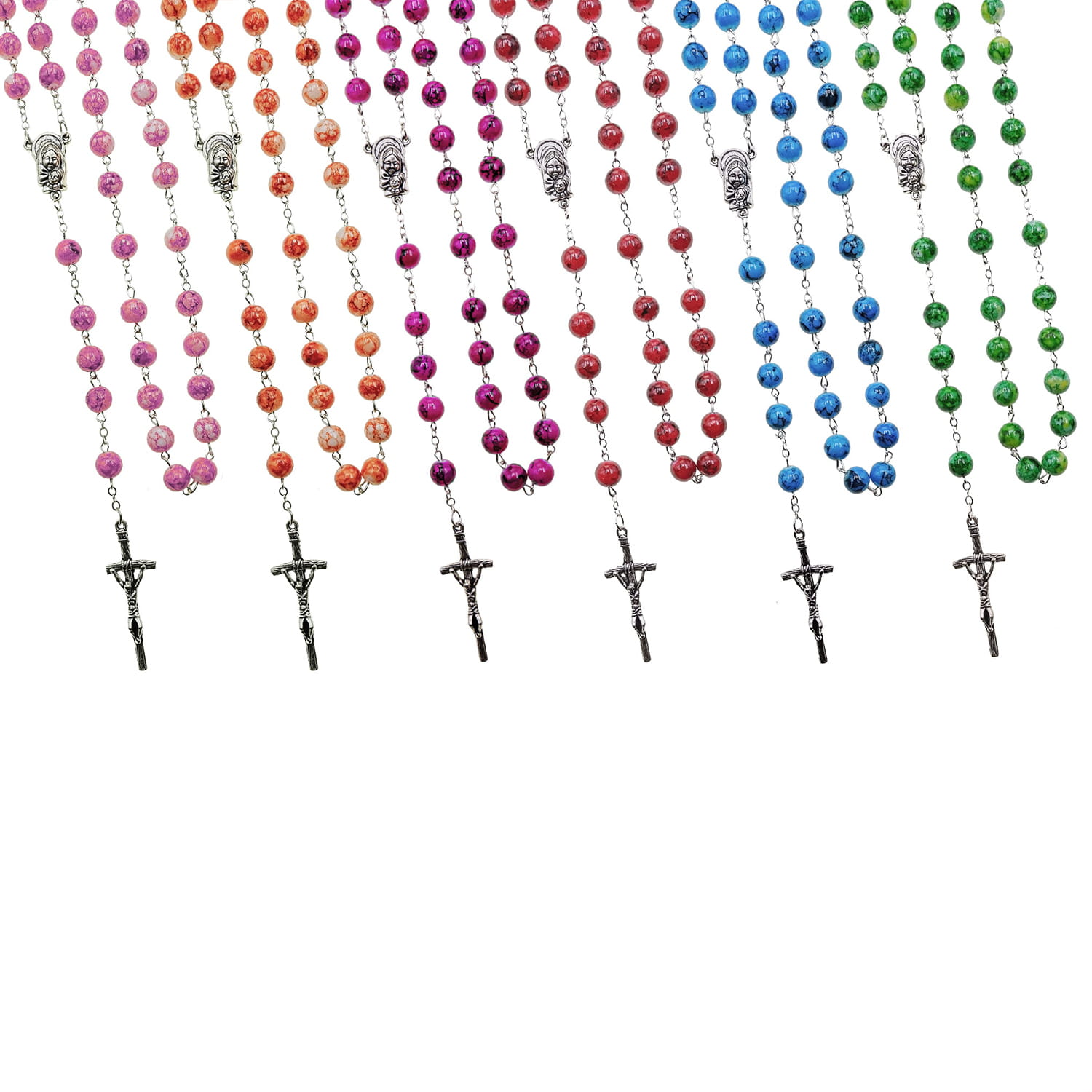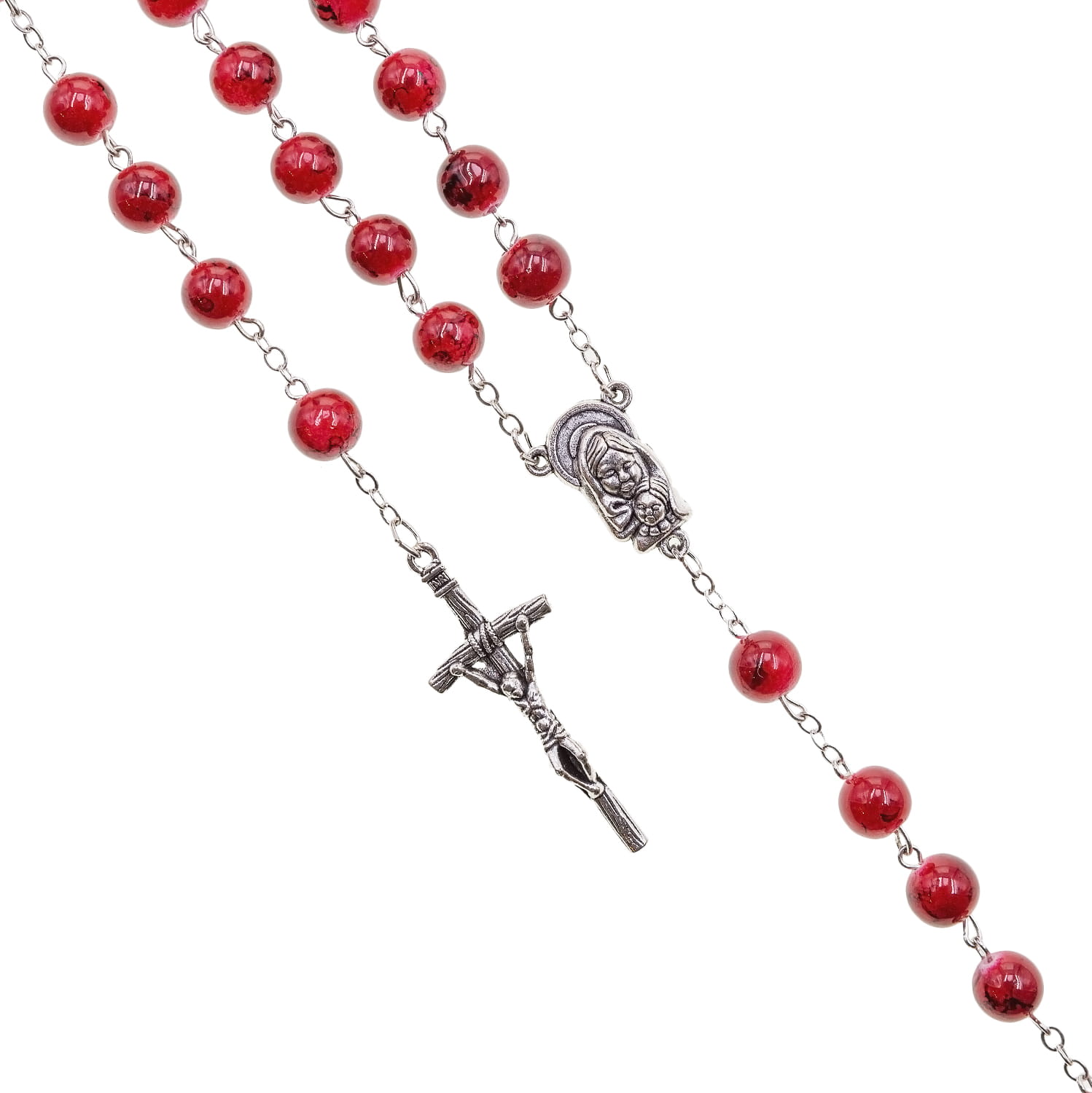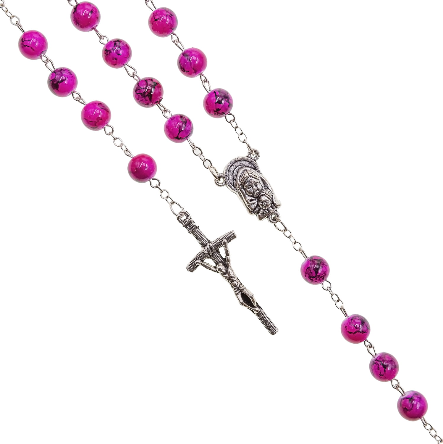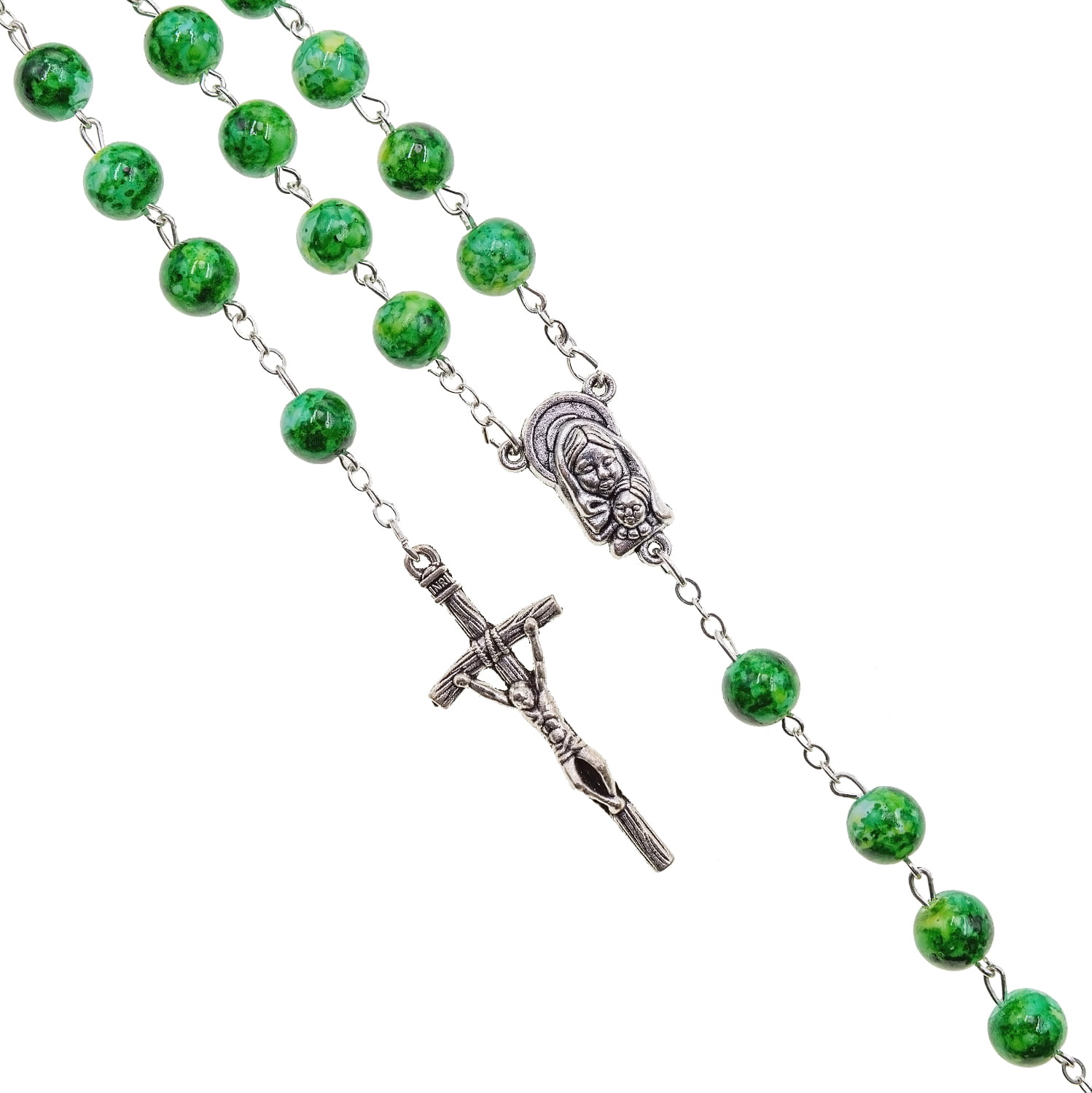 Różaniec szklany marmurkowy. Łącznik różańca z Matką Bożą z dzieciątkiem. Elementy metalowe wykonane ze stali nierdzewnej. Krzyżyk w tonacji starego srebra.