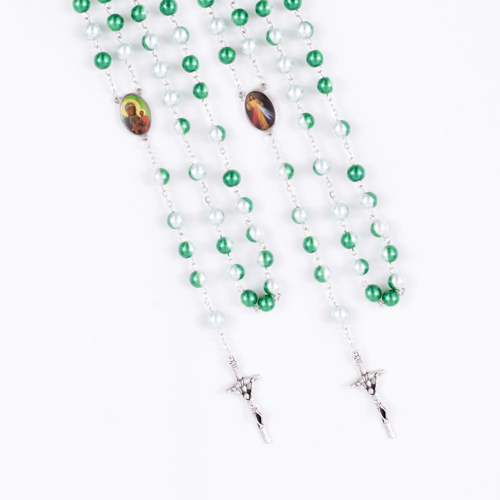 Różaniec szklany. Łącznik różańca z Matką Bożą Częstochowską i Jezusem Miłosiernym. Koraliki transparentne w tonacji zielono białej. Elementy metalowe wykonane ze stali nierdzewnej. Krzyżyk w tonacji starego srebra.