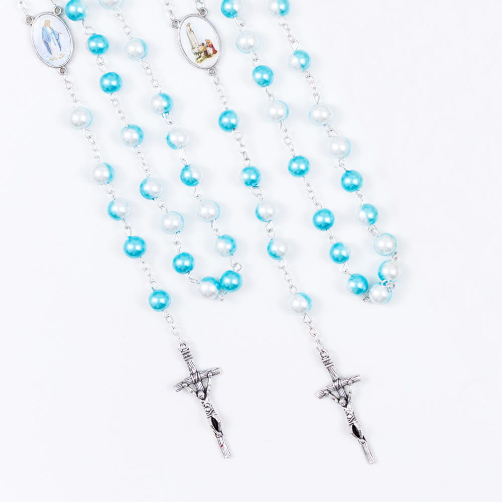 Różaniec szklany z perłową powłoką. Łącznik-medalik z Matką Bożą Niepokalaną i Matką Bożą Fatimską.Paciorki w kolorze niebiesko białym. Elementy metalowe wykonane ze stali nierdzewnej. Krzyżyk w tonacji starego srebra.