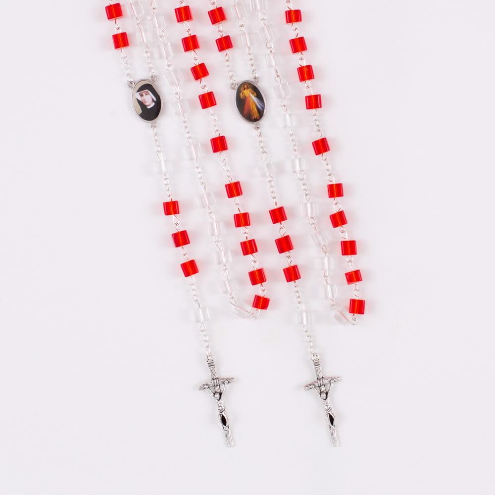 Różaniec szklany. Łącznik różańca z Siostrą Faustyną i Jezusem Miłosiernym. Koraliki czerwone o kształcie walca. Elementy metalowe wykonane ze stali nierdzewnej. Krzyżyk w tonacji starego srebra.