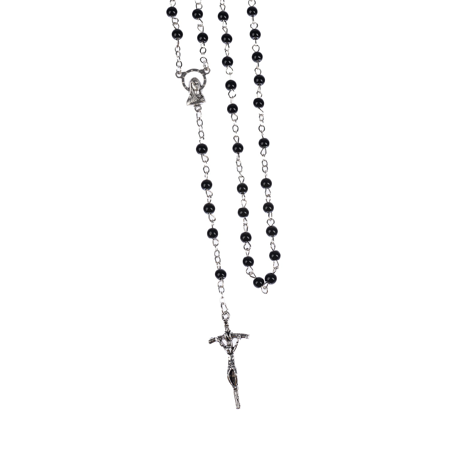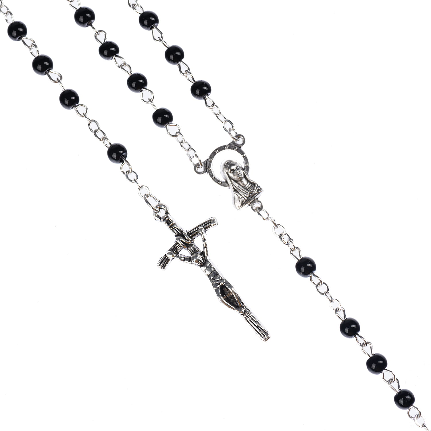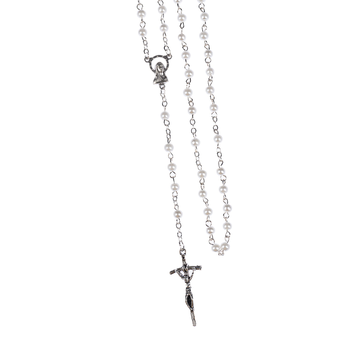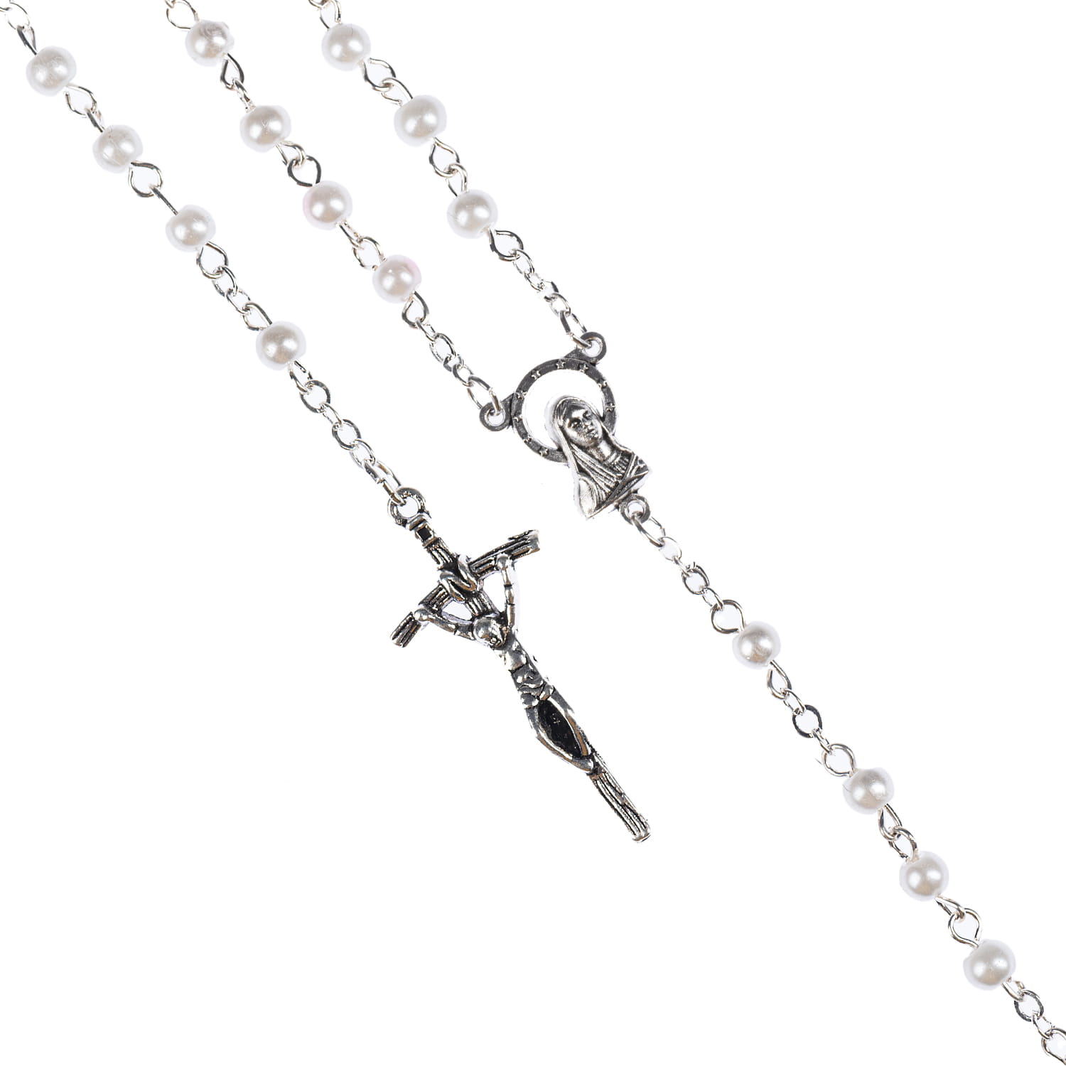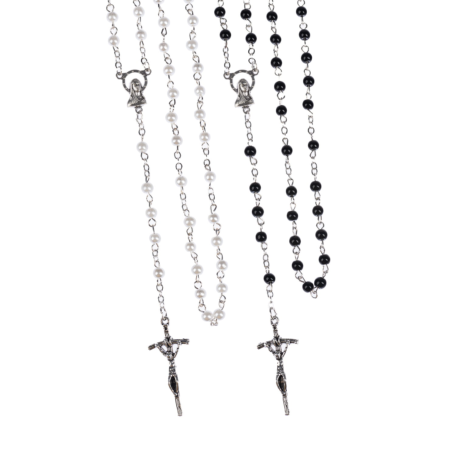 Różaniec szklany z powłoką perłową. Łącznik różańca z Matką Boską. Koraliki białe lub czarne. Elementy metalowe wykonane ze stali nierdzewnej. Krzyżyk w tonacji starego srebra.