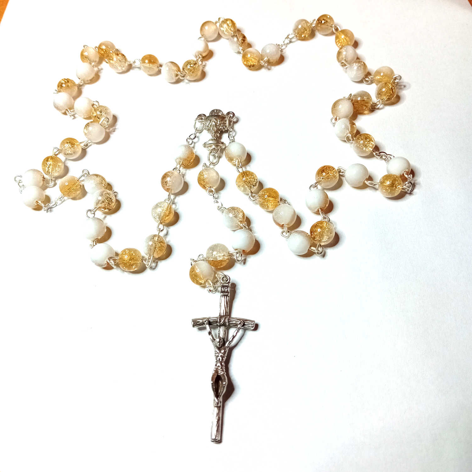 Różaniec ze szkła w kolorze złoto-białym to elegancki i subtelny przedmiot, który łączy w sobie estetykę i duchową funkcję. Jego koraliki wykonane z wysokiej jakości szkła są misternie formowane, a ich powierzchnia połyskuje delikatnym blaskiem, tworząc wyjątkowy efekt świetlny. Kolorystyka złoto-biała dodaje mu szlachetności – białe koraliki, przezroczyste lub lekko mleczne, w połączeniu ze złotymi akcentami, nadają całości lekkości i elegancji, jednocześnie podkreślając jego sakralny charakter.