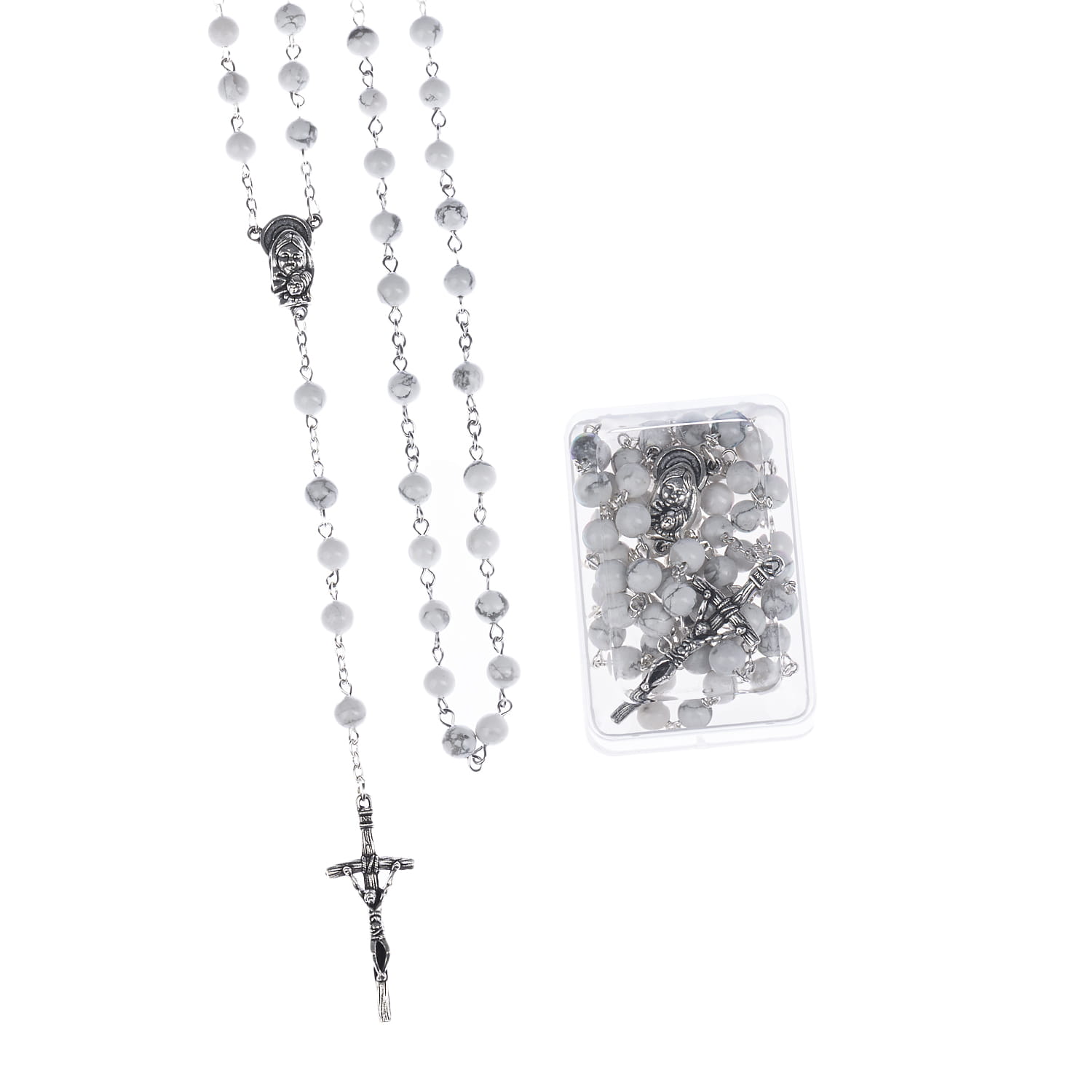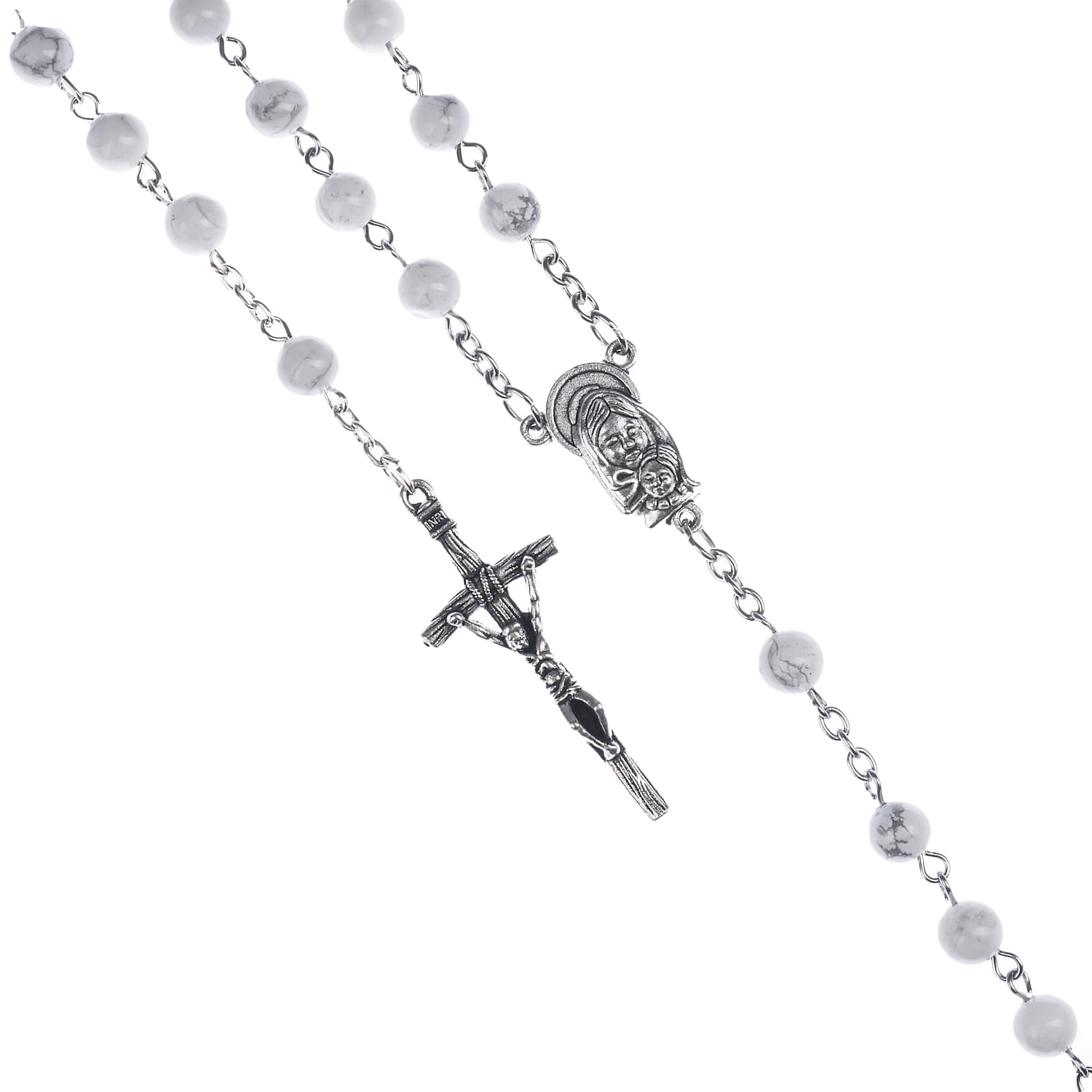 Różaniec z kamienia naturalnego - turkus. Łącznik różańca z wizerunkiem Matki Boskiej z dzieciątkiem oraz krzyżyk papieski w tonacji starego srebra. Elementy metalowe wykonane ze stali nierdzewnej. Różaniec w plastikowym pudełeczku.