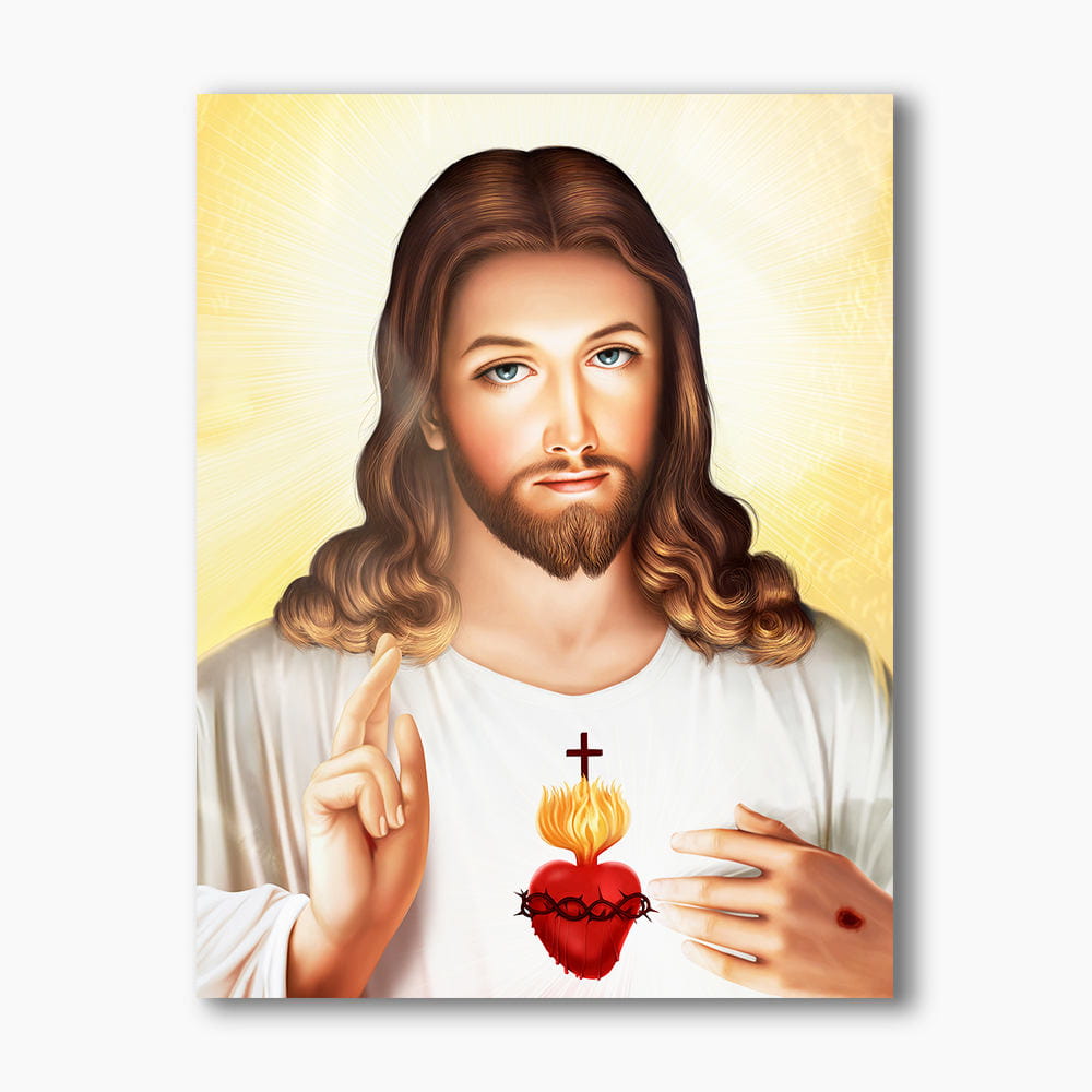 Obraz religijny przedstawiający Serce Jezusa. Obraz wykonany na doskonałej jakości płycie plexi o wysokiej transparentności i zaskakująco żywych barwach. Dzięki użyciu plexi obraz posiada wrażenie trójwymiarowości.