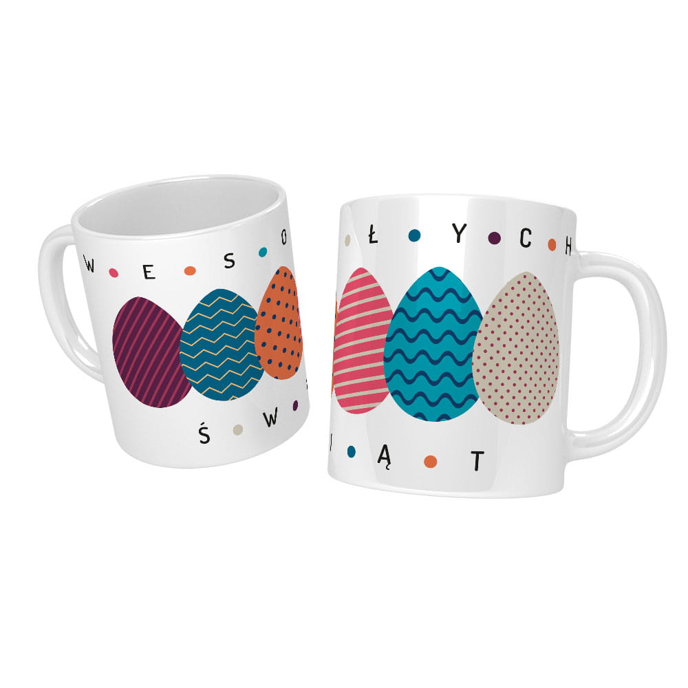 Biały kubek z motywem wielkanocnym o pojemności 330 ml. Najwyższej klasy AAA+ ceramiczny kubek odporny na mycie w zmywarce z trwałym nadrukiem i nieblednącymi kolorami.