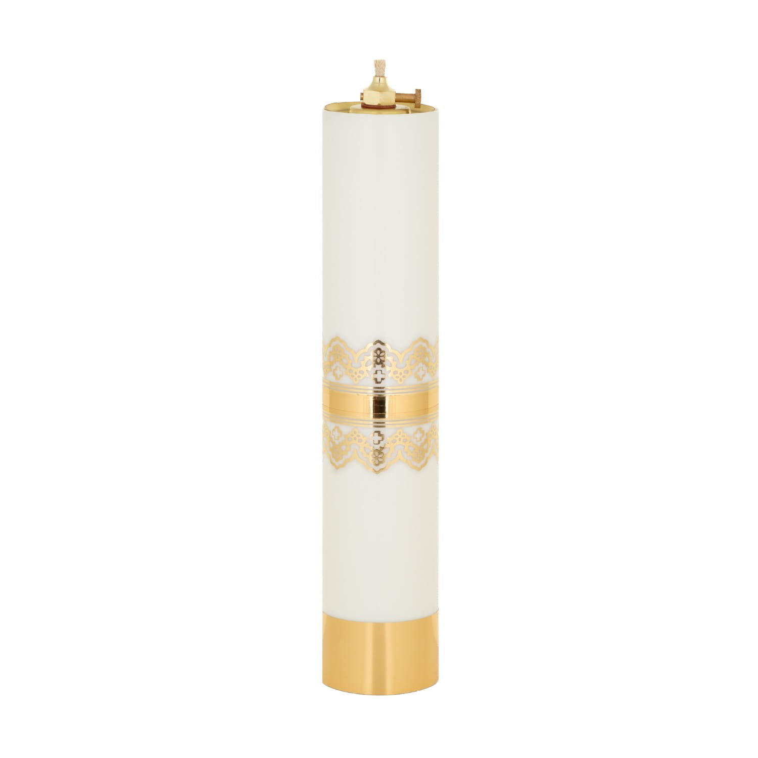 Świeca posiada wkład olejowy, co nawiązuje do tradycji liturgicznej.
