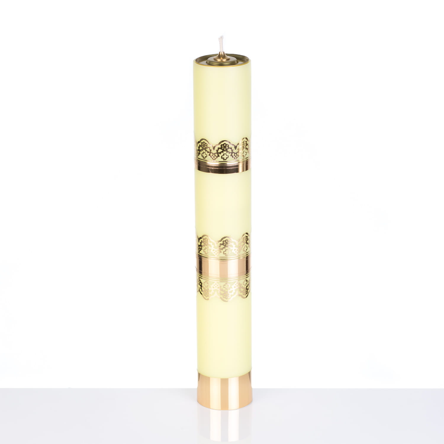 Świeca liturgiczna w kolorze żółtym z bardzo trwałego tworzywa doskonale imitującego prawdziwą parafinę. Zdobienie w kolorze złotym. Talerzyk oraz chwyt knota wkładu wykonany jest z mosiądzu. Świeca posiada wkład olejowy z regulacją. (knot regulujemy mechanicznie nie ma potrzeby gasić płomienia ).