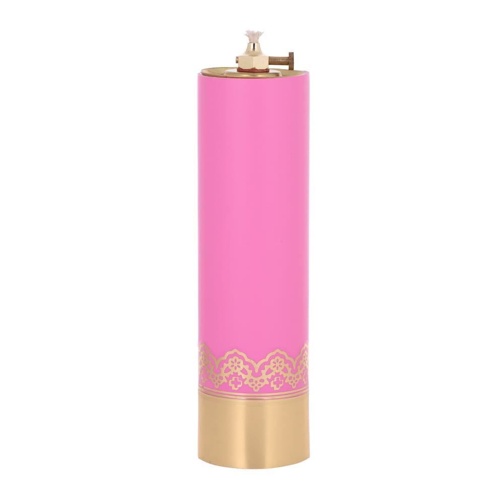 Świeca liturgiczna w kolorze różowym, wykonana z solidnego i odpornego na uszkodzenia tworzywa. Ozdobiona złotymi motywami, które nadają jej uroczysty charakter. Wewnątrz znajduje się wkład olejowy o pojemności 180 ml, z regulacją lub bez regulacji.