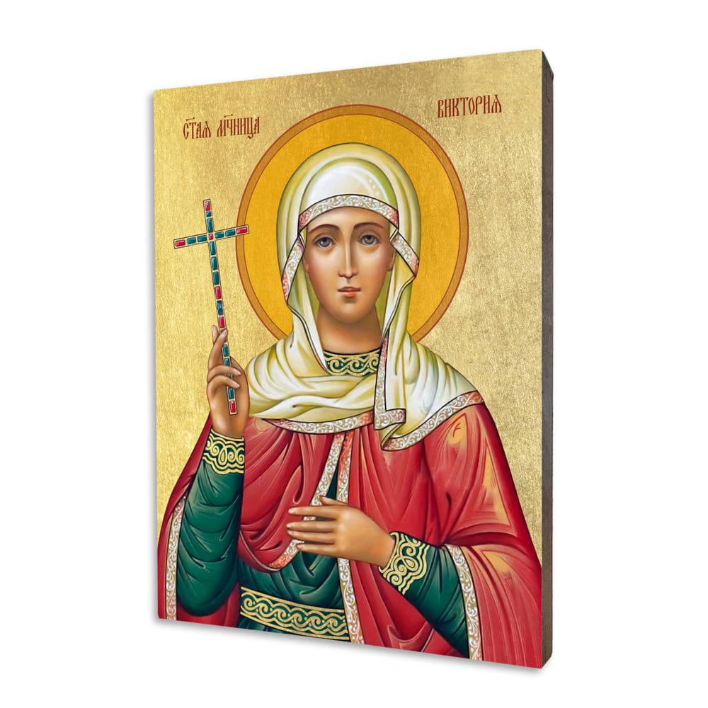 Ikona świętej Wiktorii wykonana na desce lipowej, podwójnie gruntowanej oraz uszlachetnionej płatkami pozłoty. Grafika ikony świętej Wiktorii został naniesiony przy użyciu specjalnej techniki druku bezpośrednio na deskę.