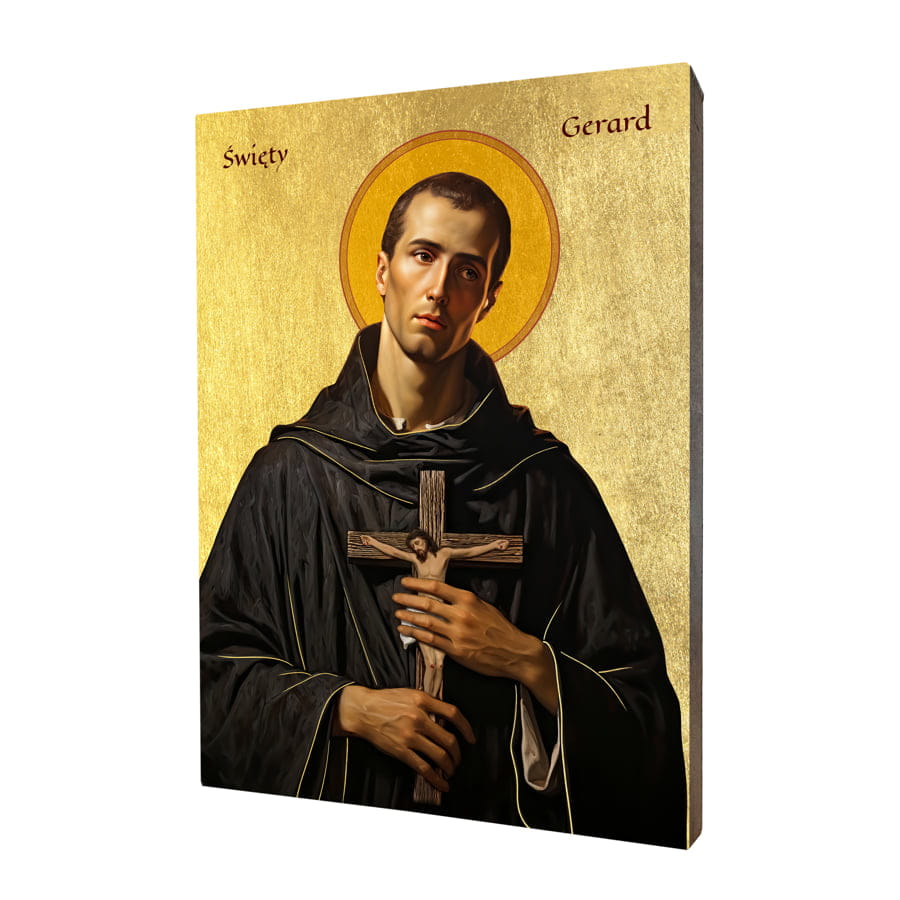 Ikona precyzyjnie ukazuje szczegóły postaci Świętego Gerarda. Jego łagodne spojrzenie, modlitewna postawa i symbolika związana z patronatem nad matkami oczekującymi są przedstawione z dbałością o każdy szczegół.