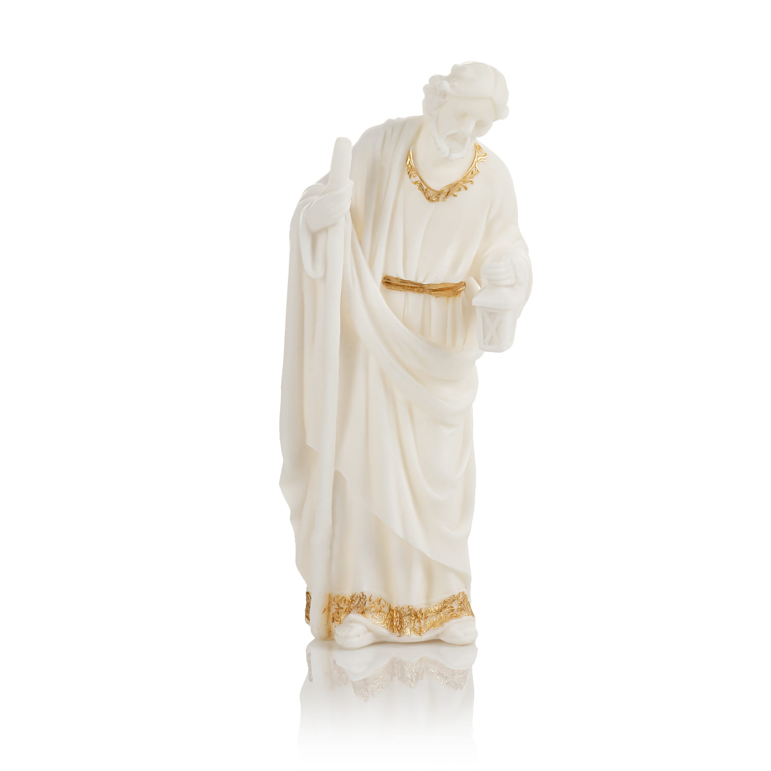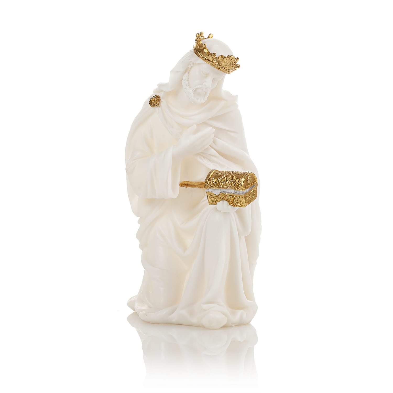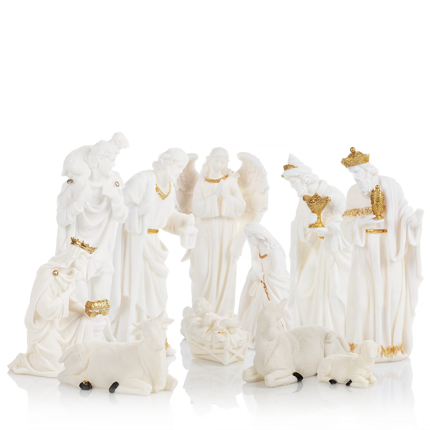 Ta efektowna szopka bożonarodzeniowa została wykonana z trwałej, wysokiej jakości żywicy, która pozwala na wierne oddanie najdrobniejszych szczegółów. Wszystkie figurki utrzymane są w eleganckiej bieli, podkreślonej złotymi akcentami – koronami Trzech Króli, zdobieniami na szatach, a także delikatnymi detalami aniołów. Połączenie bieli i złota nadaje całemu zestawowi niezwykłą czystość, blask oraz poczucie harmonii.
