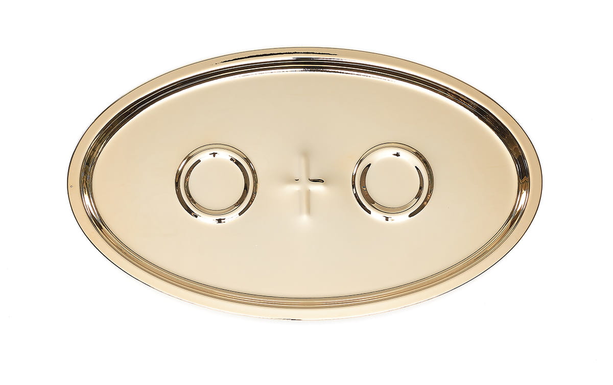 Tacka na obrączki ślubne.Taca wykonana w kształcie owalu z tłoczeniami na obrączki oraz krzyżykiem.