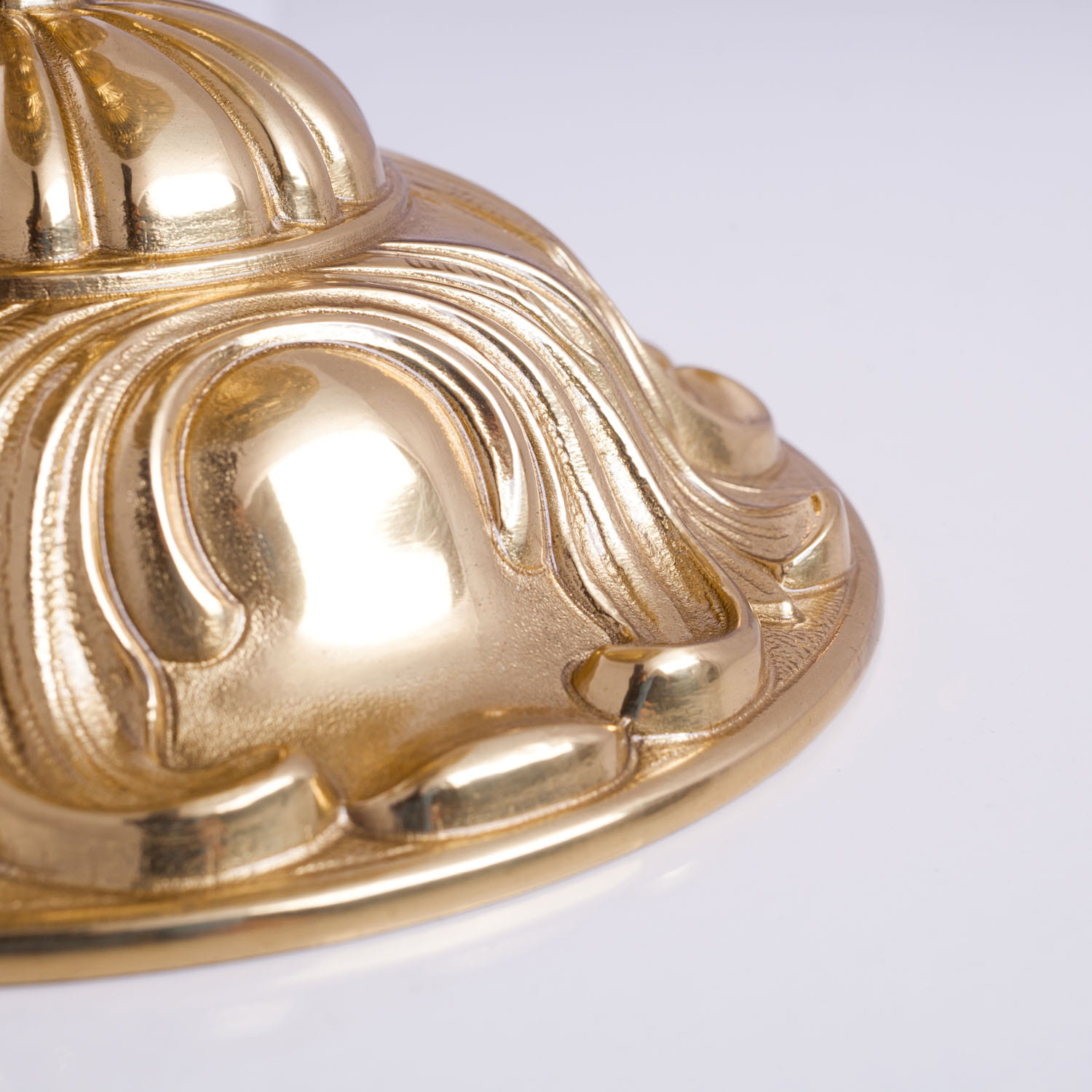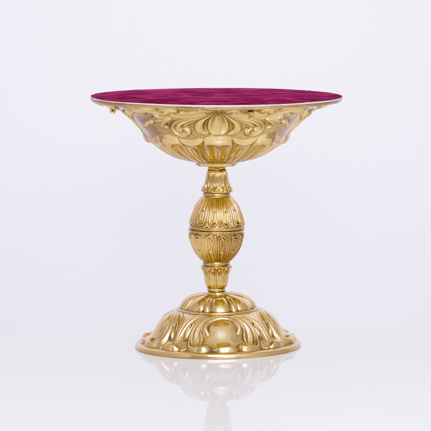 Mosiężny tron pod monstrancję wykonany z elementów włoskich. Czasza , nodus oraz podstawa gustownie ozdobiona. Taca pod monstrancję oklejona materiałem w kolorze bordo. Zabezpieczony proszkowym lakierem bezbarwnym.