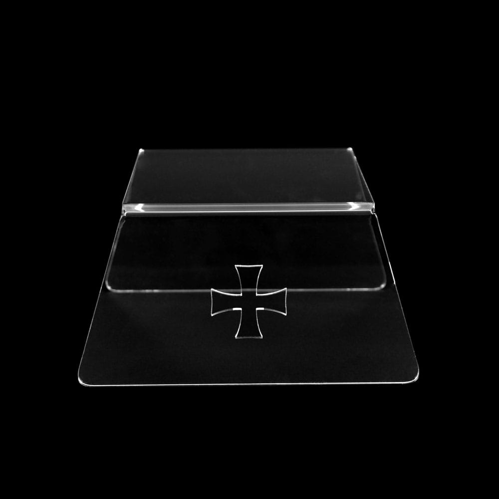 Tron mały wykonany z pleksi. Na jednym z boków widnieje wycięty krzyżyk.