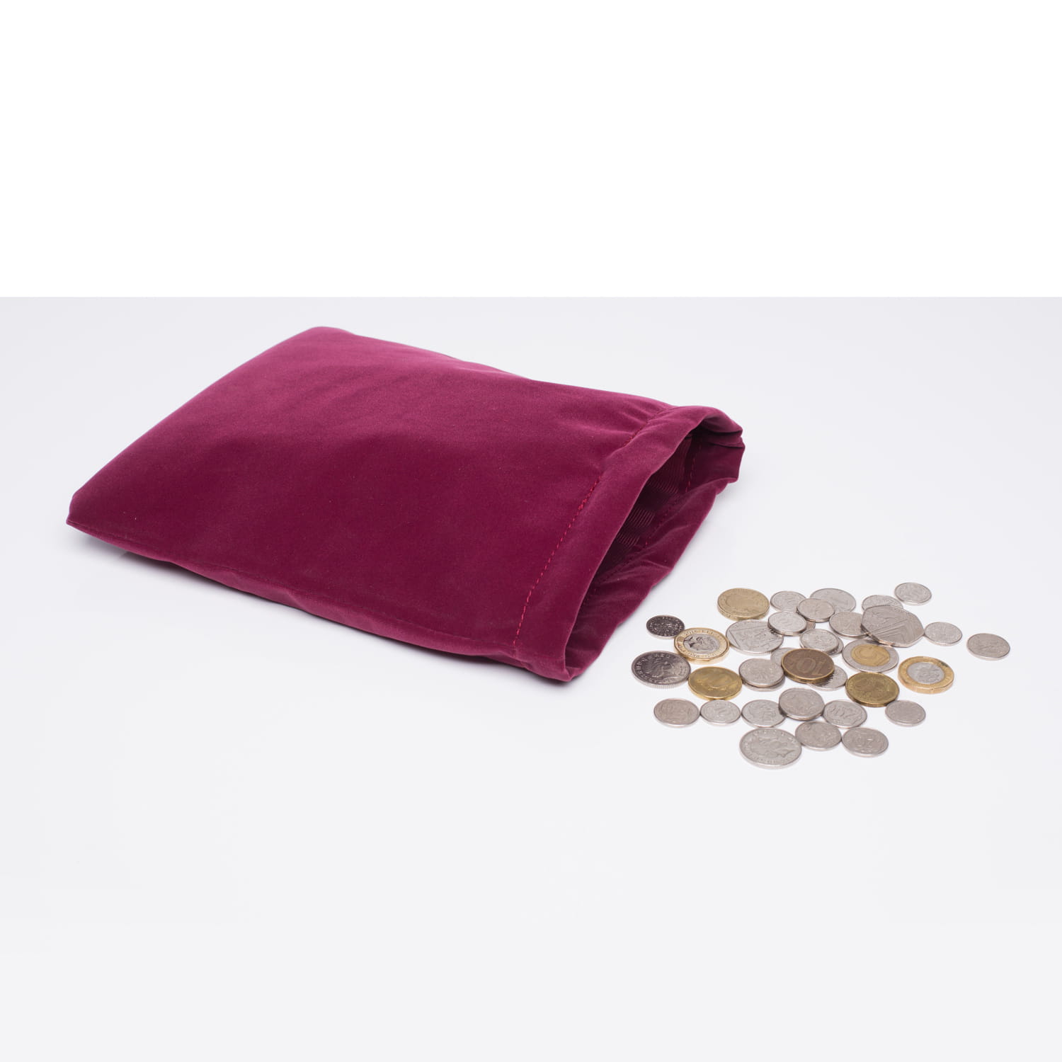 Woreczek na pieniądze zaciągany na sznurek ozdobny z zawleczką zapobiegającą otwieraniu.