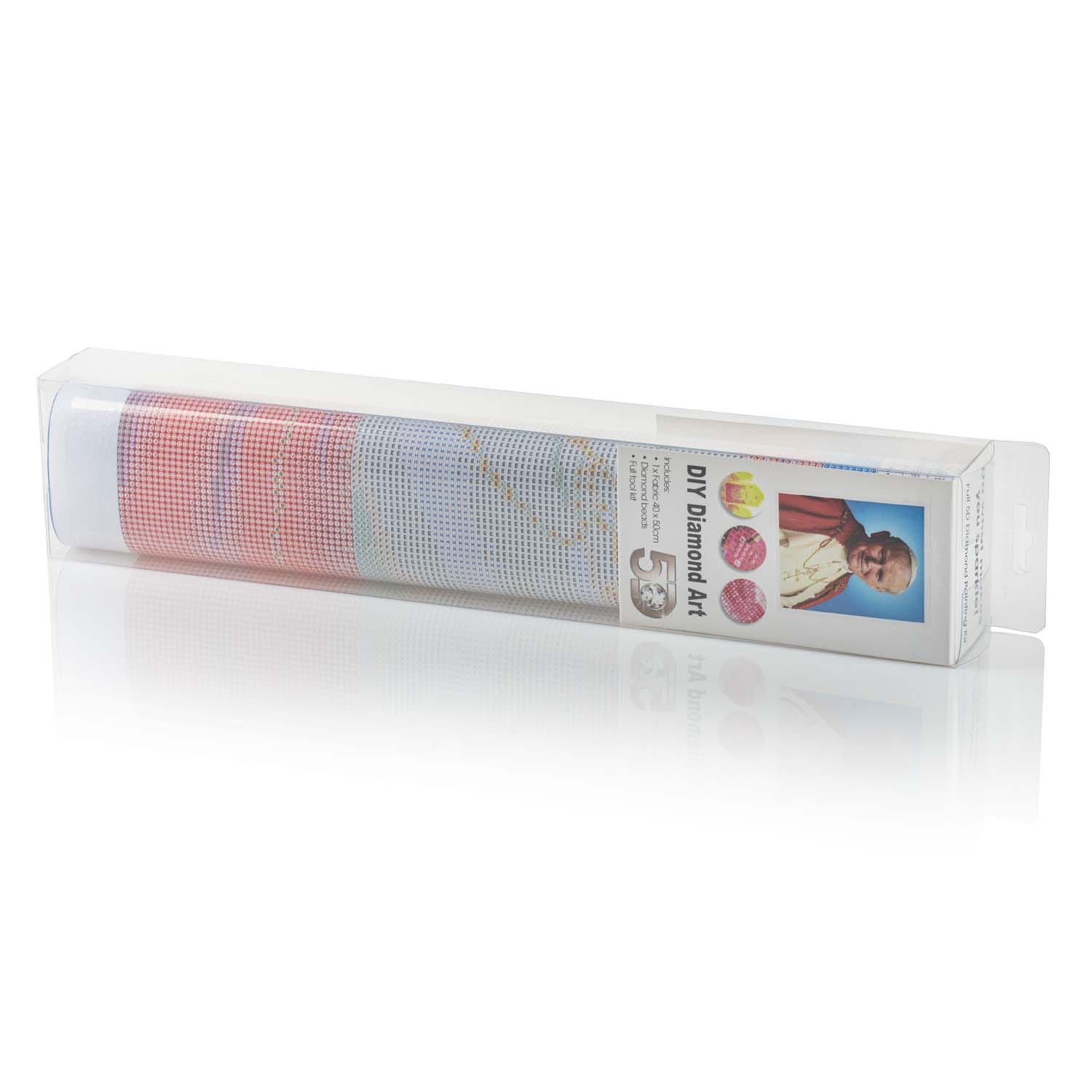 Płótno z nadrukowanym obrazem, pokryte klejem i zabezpieczone folią woreczki z diamencikami, z numerami pozwalającymi na łatwe dopasowanie do symbolu zgodnie z legendą umieszczoną na płótnie