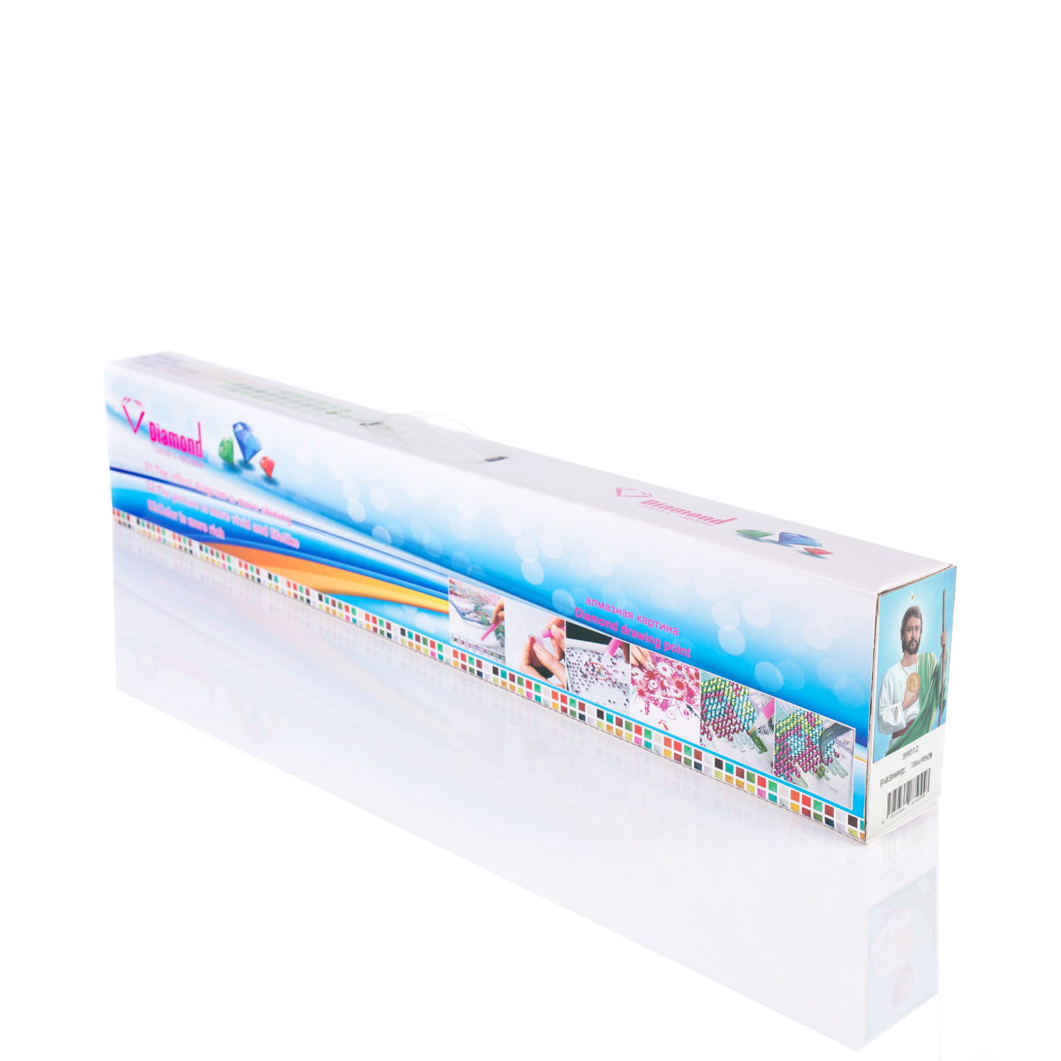 Płótno z nadrukowanym obrazem, pokryte klejem i zabezpieczone folią woreczki z diamencikami, z numerami pozwalającymi na łatwe dopasowanie do symbolu zgodnie z    legendą umieszczoną na płótnie