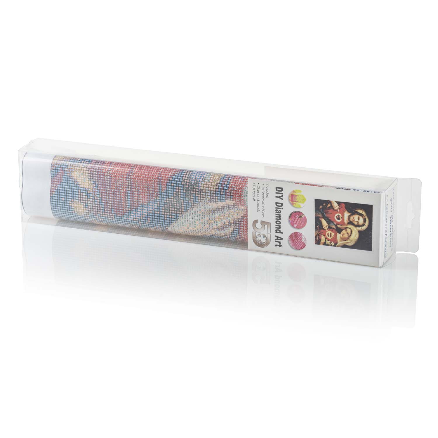 Płótno z nadrukowanym obrazem, pokryte klejem i zabezpieczone folią woreczki z diamencikami, z numerami pozwalającymi na łatwe dopasowanie do symbolu zgodnie z legendą umieszczoną na płótnie